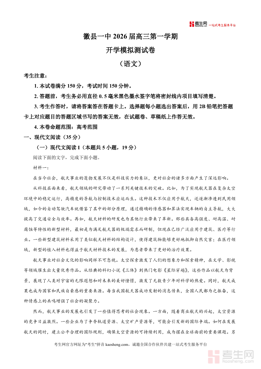 《精品解析:2026届甘肃省陇南市徽县第一中学高三上学期开学模拟测试语文试卷(原卷版).docx》是一份针对2026届徽县一中高三学生高考备考 的高质量模拟测试资料该试卷严格遵循高考命题范围涵盖现代文阅读(含信息类文本与文学类文本)古代诗文阅读等核心模块完整还原高考语文试卷结构与题型设置特色亮点在于其紧密贴合徽县一中教学实际及高考考查方向试题选材兼顾时代性与经典性如现代文阅读选取航天事业社会影响相关材料文学类文本节选《瓦猫》等具有文化内涵作品能有效考查学生信息提取文学鉴赏及语言运用能力