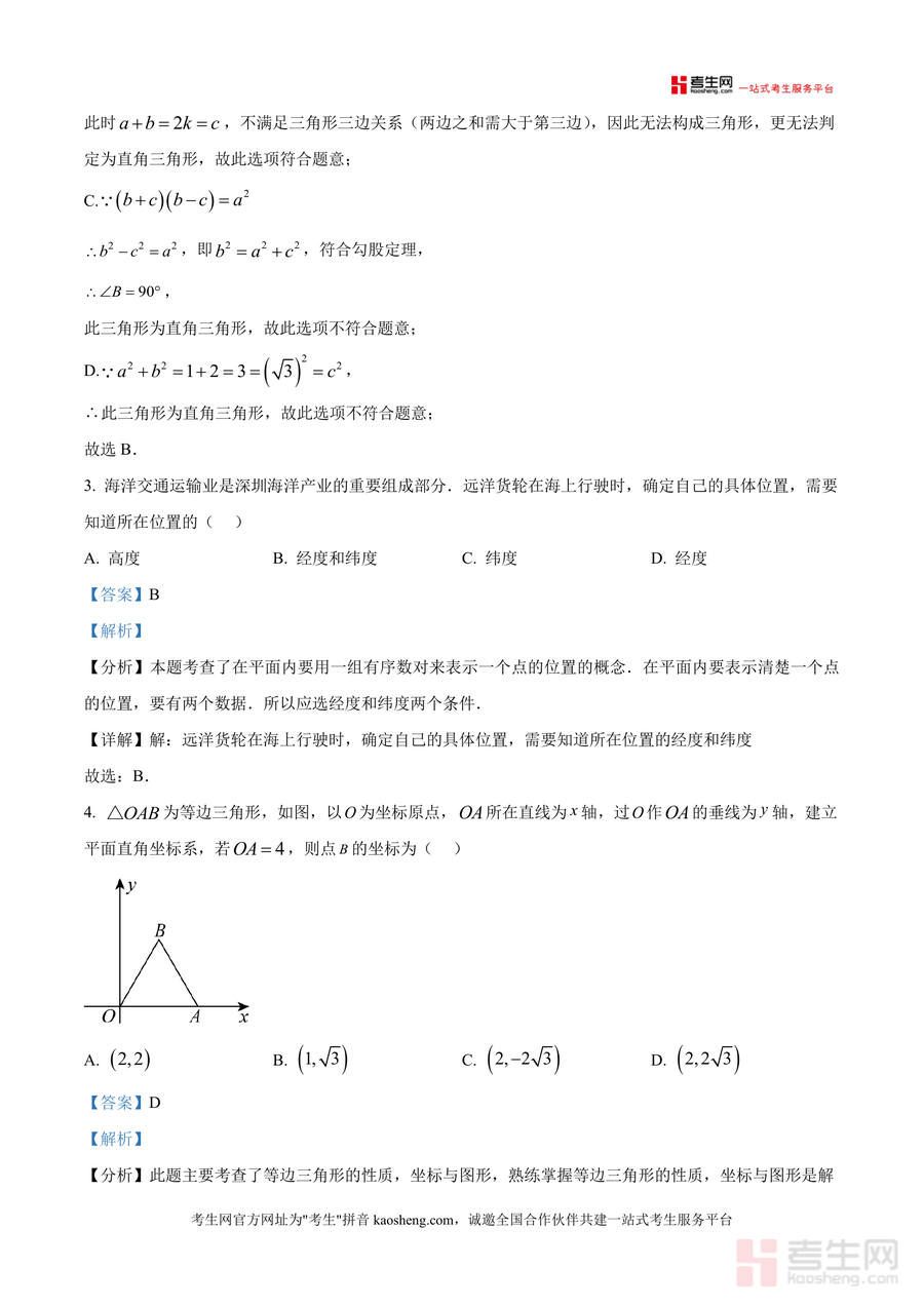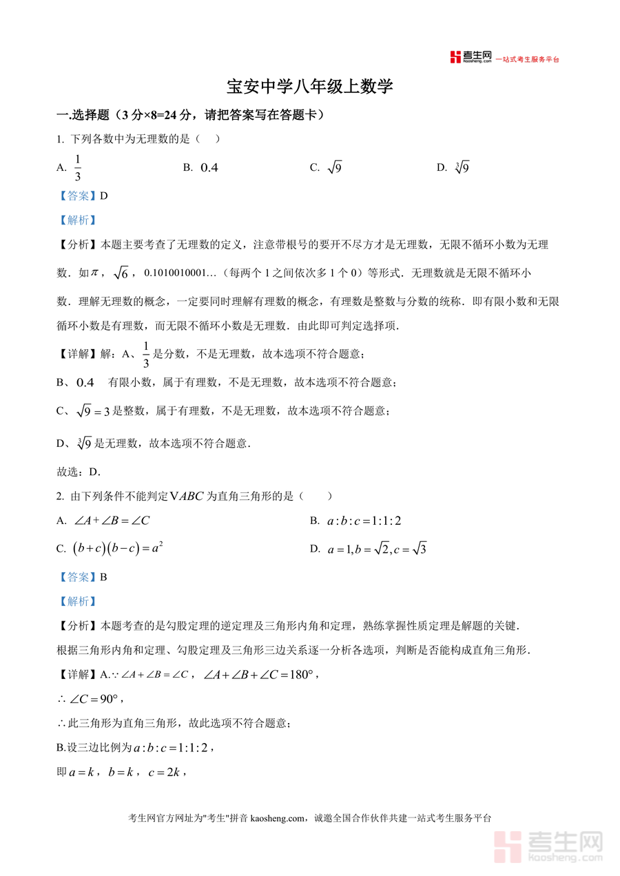 《精品解析:广东省深圳市宝安中学2025-2026学年上学期1月月考八年级数学试卷(解析版).docx》是一份针对深圳市宝安中学八年级学生数学阶段性复习与备考用的专业资料,聚焦上学期核心知识模块,覆盖无理数识别、直角三角形判定、平面直角坐标系应用、数据统计分析及几何变换等重点内容。每份题目均配备详尽解析过程,包含考点定位、思路梳理及规范解答步骤,并补充易错点提示与拓展延伸内容。作为真题解析类资料,其核心亮点在于紧密贴合宝安中学教学进度与校考命题风格,能帮助学生快速定位知识薄弱环节。