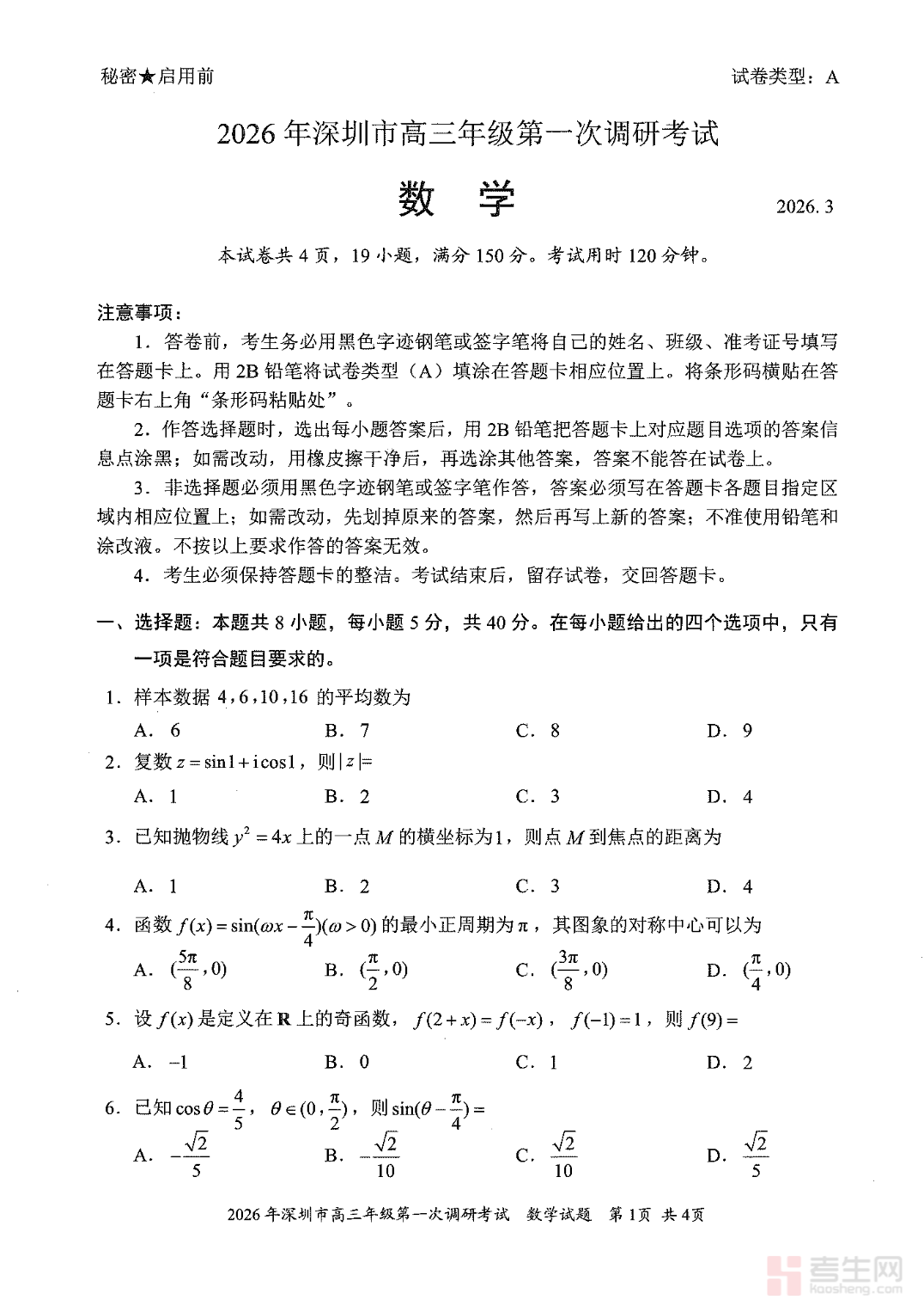 深圳市 2026 年高三年级第一次调研考试(数学试卷)由深圳市教育科学研究院命题,严格对标新高考数学命题要求,聚焦数学抽象、逻辑推理、数学建模、直观想象等核心素养。试卷覆盖函数、导数、数列、立体几何、解析几何、概率统计等核心考点,题型规范、难度梯度合理,注重知识综合运用与解题思维能力考查,选材贴合高考命题趋势与高中教学实际。本试卷可用于高三一轮复习效果检测,帮助考生精准定位薄弱环节、优化复习策略,是 2026 届高三数学考生备考的重要实战资料。请添加微信 18617049513 进专属群,获取更多免费资源!