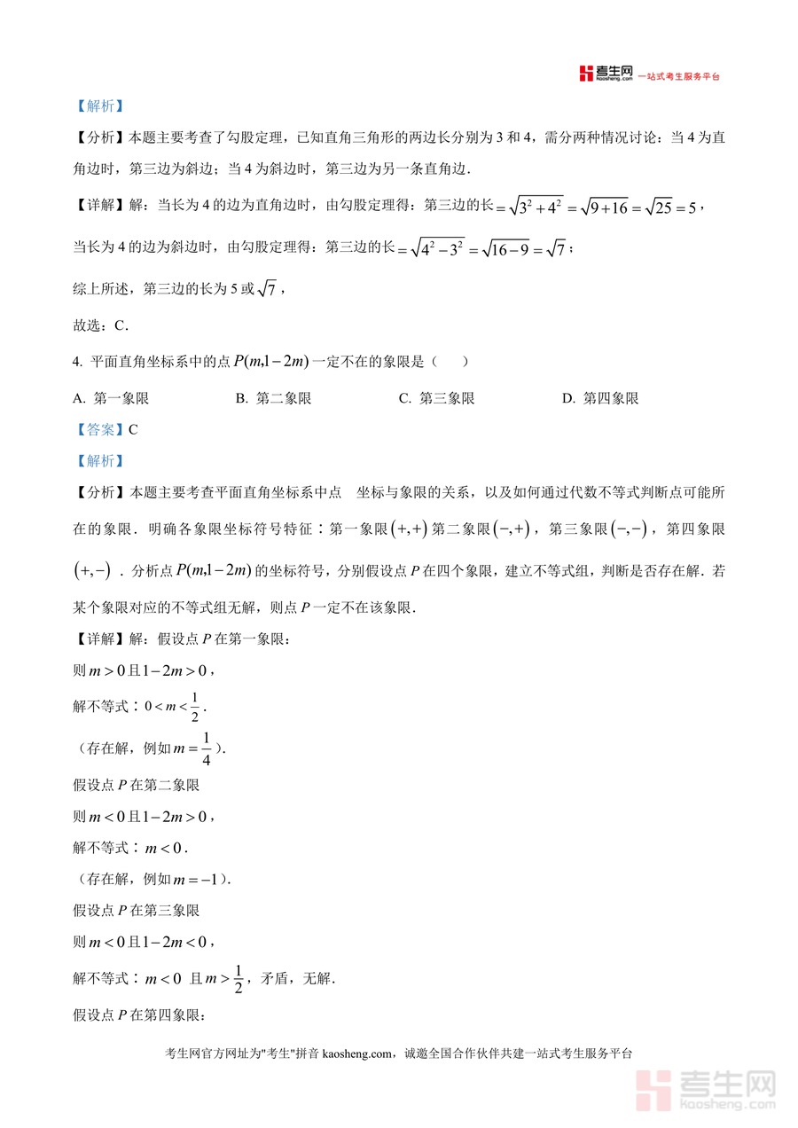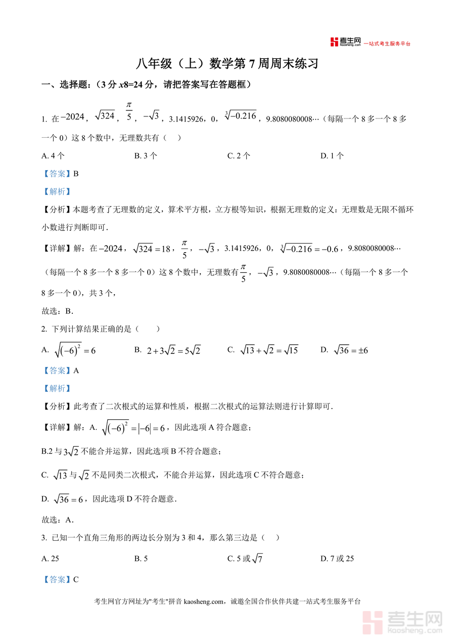 《精品解析:广东省深圳市宝安中学2025-2026学年八年级上学期第7周周测数学试卷(解析版)》是一份针对八年级上册数学阶段性学习需求打造的高质量备考资料。文件包含完整试卷及逐题解析内容,覆盖选择题、填空题、解答题三大题型,涉及无理数识别、二次根式运算、勾股定理应用、一次函数图像与性质、二元一次方程组解法等核心知识点;每道题均配备考点定位分析、详细解题步骤及易错点提示——如对直角三角形第三边计算分情况讨论思路梳理,对一次函数图像象限判断逻辑推导,对折叠问题中勾股定理应用场景拆解,体现出真题解析专业性与针对性。