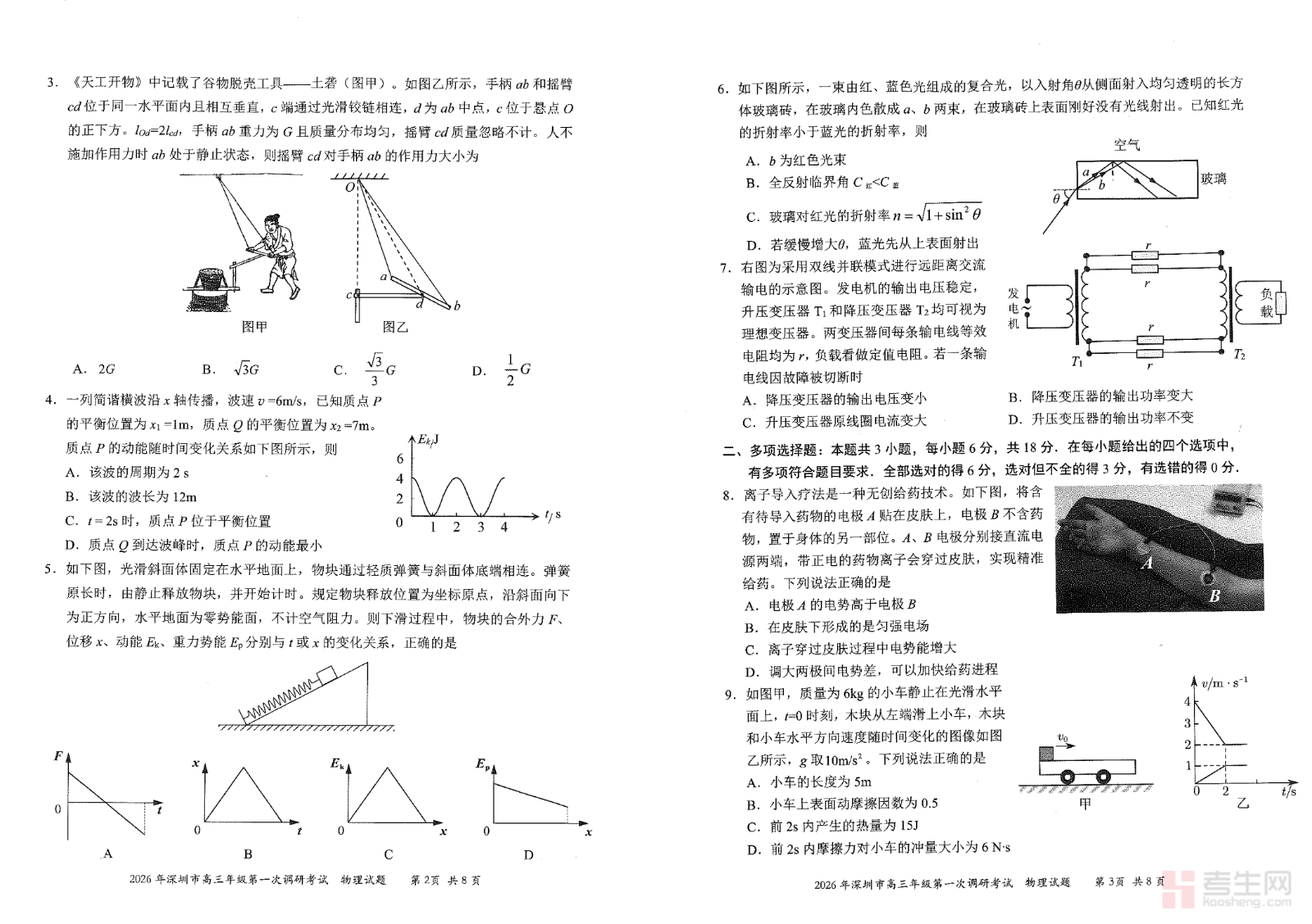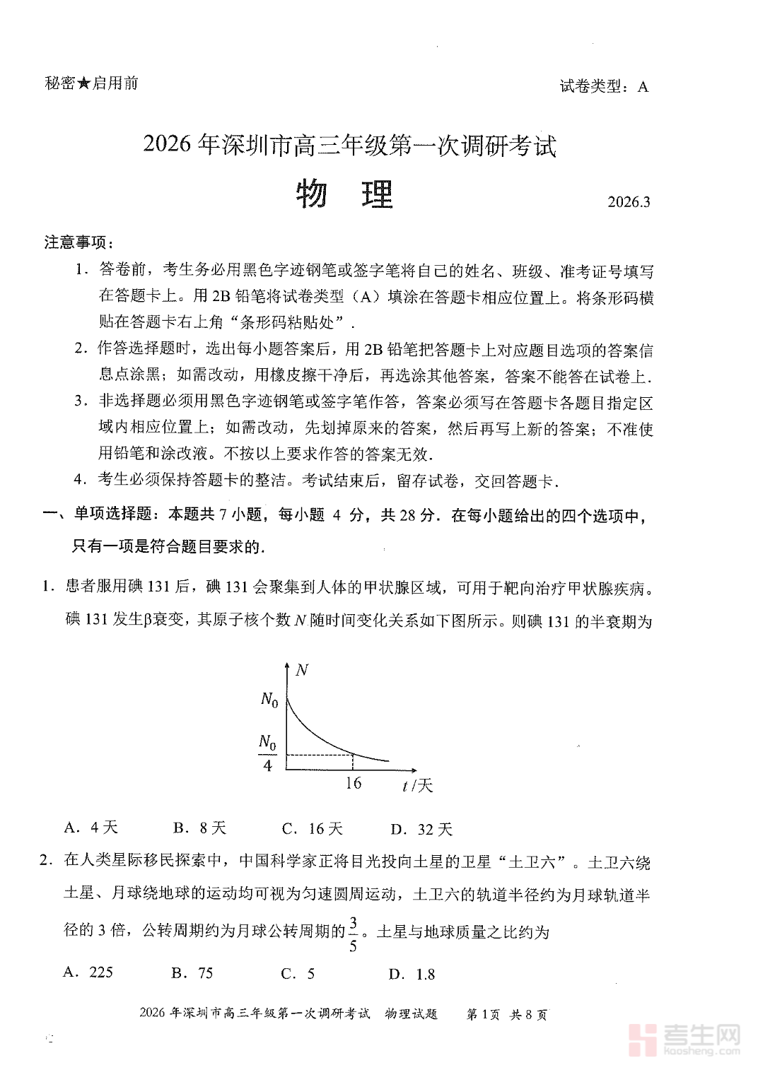 深圳市 2026 年高三年级第一次调研考试物理试卷紧扣新高考物理命题要求,全面考查学生的物理核心素养。试卷覆盖力学、电磁学、热学、光学及近代物理等核心模块,题型涵盖选择题、实验题、计算题,难度梯度设置合理,既注重基础知识点的考查,也侧重对学生逻辑推理、物理建模、实验探究及综合分析能力的检验。试题结合生活实际与物理前沿,突出知识的灵活运用,贴合高三一轮复习的检测需求,助力考生精准定位知识漏洞,优化备考策略。请添加微信 18617049513 进专属群,获取更多免费资源!