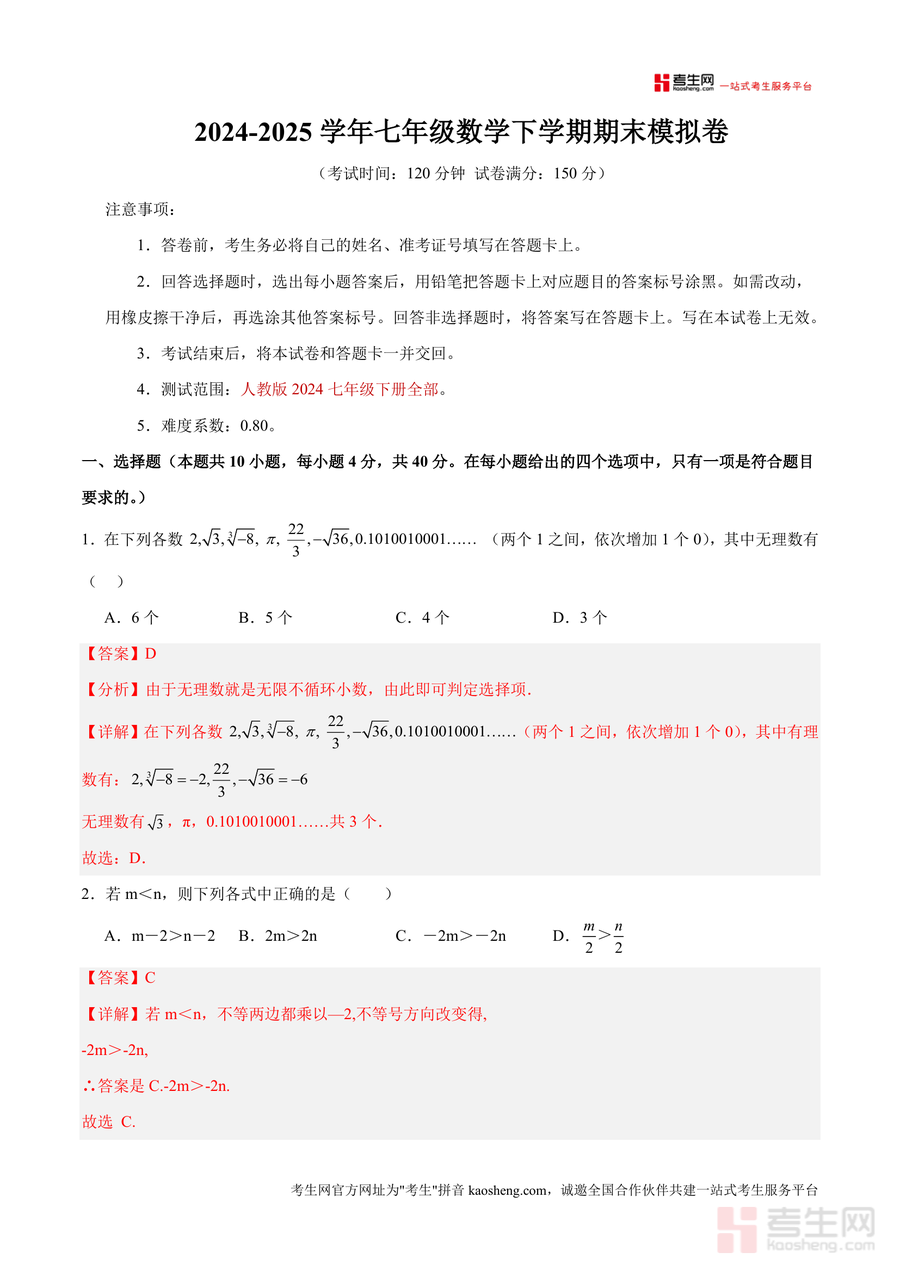 《七年级数学期末模拟卷(全解全析)(重庆专用).docx》是一份针对重庆地区七年级下学期数学期末备考设计的专用模拟资料。其核心内容涵盖人教版2024七年级下册全部知识点,试卷结构严格遵循本地期末考要求——考试时间120分钟、满分150分,包含选择题(10小题40分)、填空题(8小题32分)、解答题(8小题78分)三大题型。特色亮点在于全解全析模式,每道题均配备详细考点分析、规范解答步骤及精准答案:如无理数判断题明确无限不循环小数定义,不等式变形题强调不等号方向变化规则,几何证明题清晰标注平行线判定定理,帮助学生理解解题逻辑与知识点应用细节。