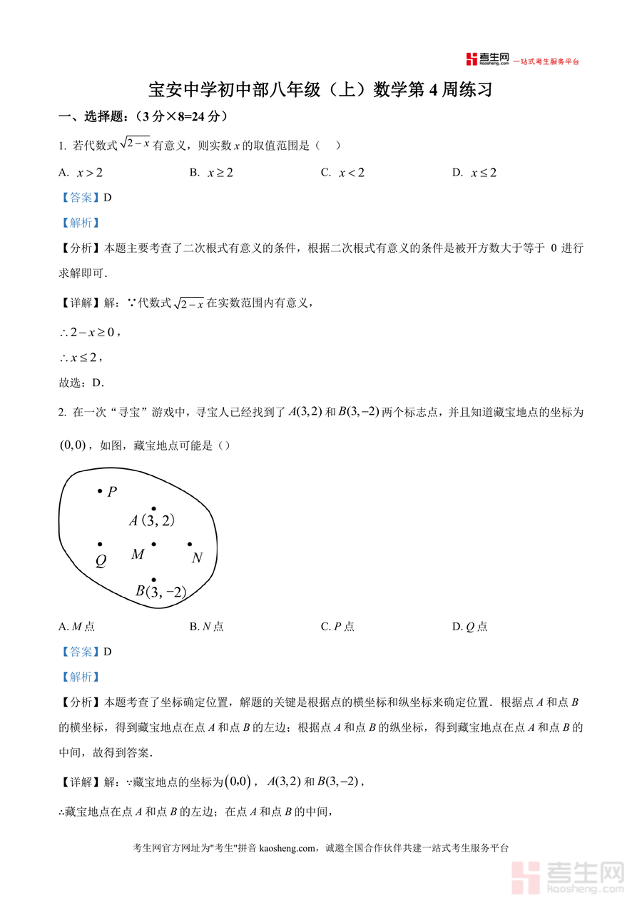 《精品解析:广东省深圳市宝安中学2025-2026学年八年级上学期第四周周测数学试卷(解析版).docx》是一份聚焦八年级上学期数学阶段性测评需求的优质真题解析备考资料。该资料涵盖选择题(8道共24分)、填空题(5道共15分)、解答题(6道共61分)三大题型,每道题目均配备深度解析——包含考点定位(如二次根式有意义条件、坐标确定位置、一次函数性质等核心知识点)、分步解题过程及易错点提醒;其特色在于紧密结合宝安中学教学进度与本地校考命题方向,将抽象数学概念转化为可操作解题策略,助力学生掌握关键考点。
