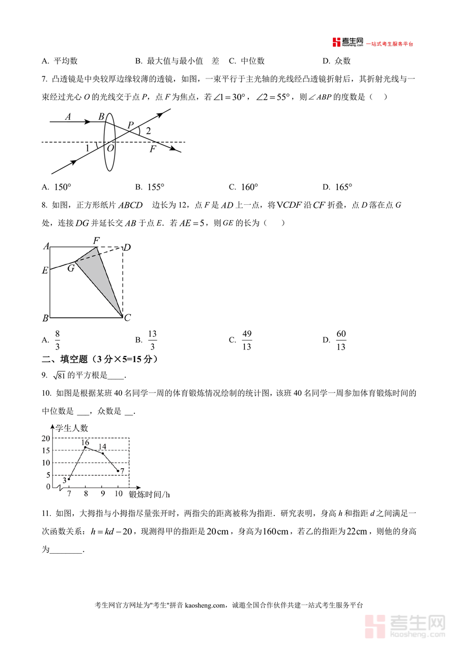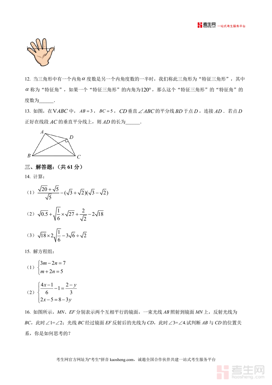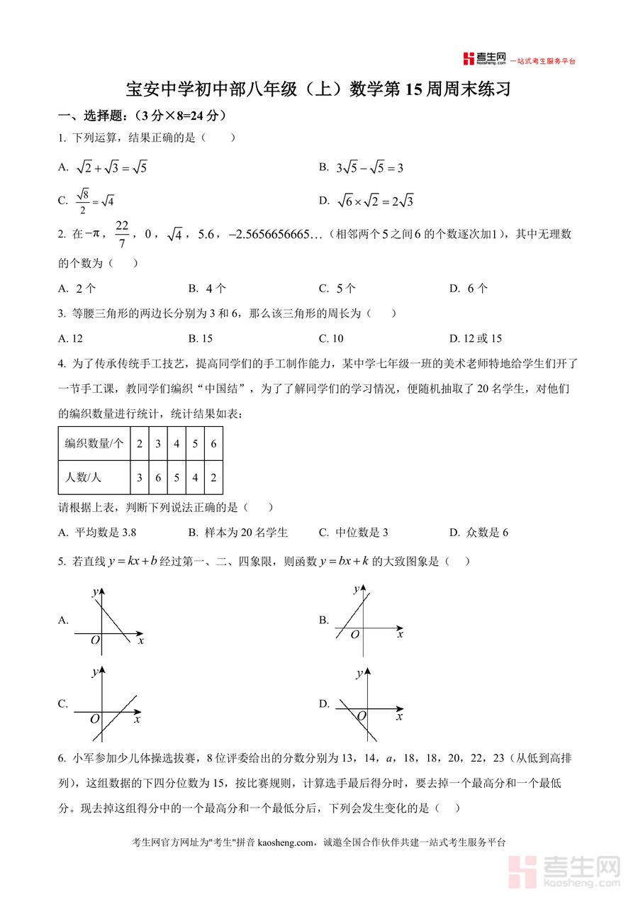 《精品解析:广东省深圳市宝安中学初中部2025-2026学年八年级上学期数学第十五周周测(原卷版).docx》是一份聚焦八年级上册数学阶段性学习成果检测的高质量备考资料。该资料严格贴合宝安中学初中部教学进度与考核要求,涵盖实数运算、等腰三角形性质、一次函数图象与应用、统计量计算、几何证明及创新型新定义问题等核心知识点。题型设置全面合理:选择题8道考查基础概念与知识应用(如无理数判断、统计量分析);填空题5道侧重细节理解与计算能力(如平方根求解、特征三角形角度计算);解答题7道融合综合分析与逻辑推理能力(如等垂四边形探究、双线关联点新定义问题),能有效检验学生对知识的灵活运用水平。