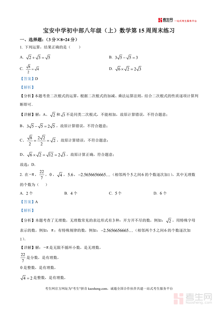 《精品解析:广东省深圳市宝安中学初中部2025-2026学年八年级上学期数学第十五周周测(解析版)》是一份针对该校八年级上学期数学第十五周教学内容的真题解析类备考资料。该资料包含选择题8道、填空题5道及解答题4道三大题型,覆盖二次根式运算、无理数识别、等腰三角形周长计算、统计量分析、一次函数图像判断等核心知识点;每道题目均配备详细考点分析、分步解题过程及易错点提示,如选择题中对二次根式加减乘除法则应用逐项验证,填空题里关于平方根性质的精准阐释,解答题中对全等三角形判定与性质的综合运用等。