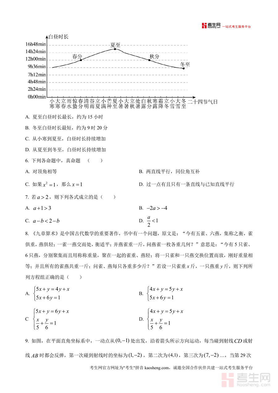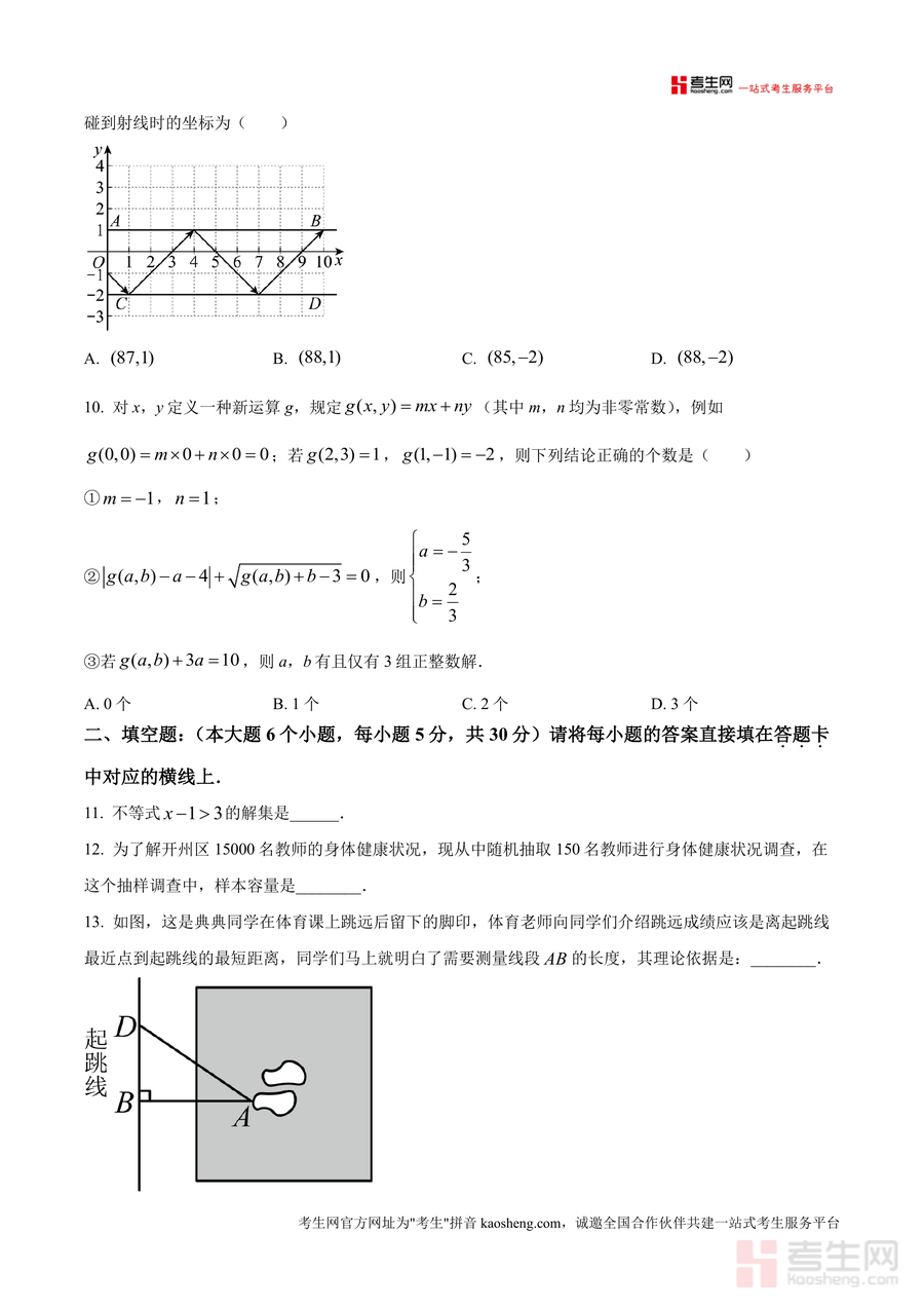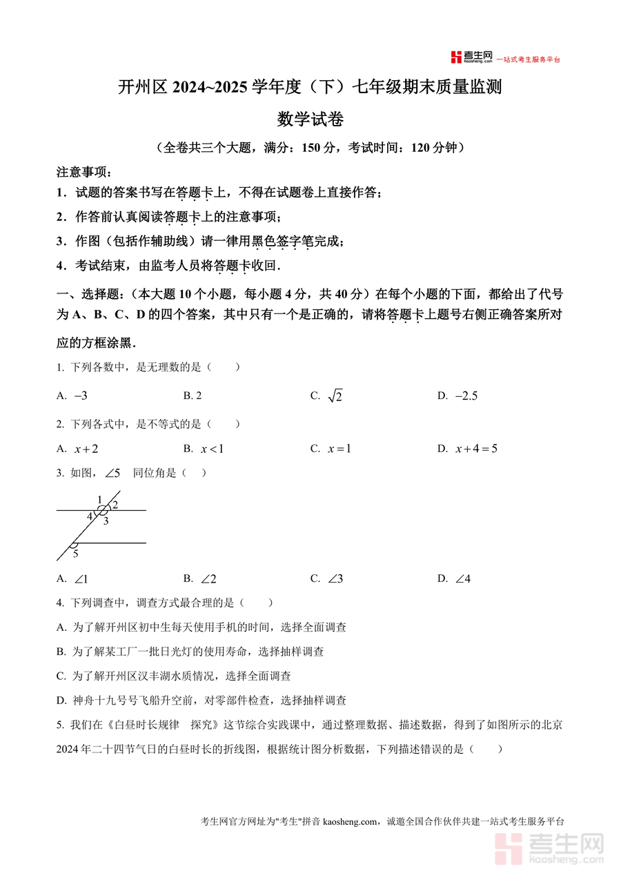 《精品解析:重庆市开州区2024-2025学年七年级下学期6月期末数学试题(原卷版).docx》是一份针对开州区七年级下学期数学期末监测的权威备考资料。该资料完整呈现全卷三大题(10道选择、6道填空、8道解答)共150分、120分钟考试时长的原卷结构,并包含答题规范等注意事项。内容覆盖无理数识别、不等式应用、同位角判定、抽样调查分析、统计图解读、命题判断、方程组应用及新定义运算等核心知识点,融入开州本地情境(如汉丰湖水质调查、龙珠茶带货案例)与《九章算术》等数学文化元素,让真题解析兼具地域针对性与知识深度。