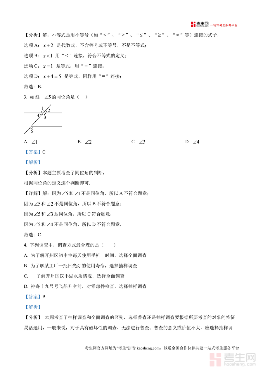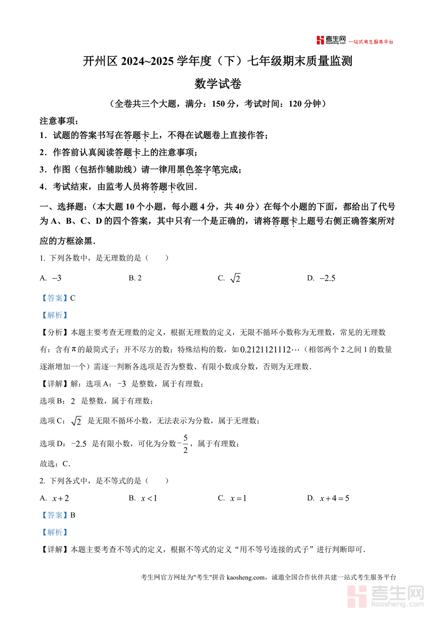 《精品解析:重庆市开州区2024-2025学年七年级下学期6月期末数学试题(解析版).docx》是一份聚焦开州区区域期末考情、适配七年级数学核心知识的精准备考资料。文件包含完整真题原题与逐题深度解析两大部分——原题严格还原开州区期末统考题型结构(10道选择+6道填空+解答题),覆盖无理数识别、不等式性质、几何图形位置关系、统计调查方法等七年级下册核心考点;解析部分则针对每道题设置“考点分析”“解题思路”“易错点提示”模块,如选择题第1题明确无理数定义及常见类型(含π最简式、开不尽方数等),填空题第13题结合垂线段最短原理解释跳远成绩测量依据,帮助学生精准把握考点本质。