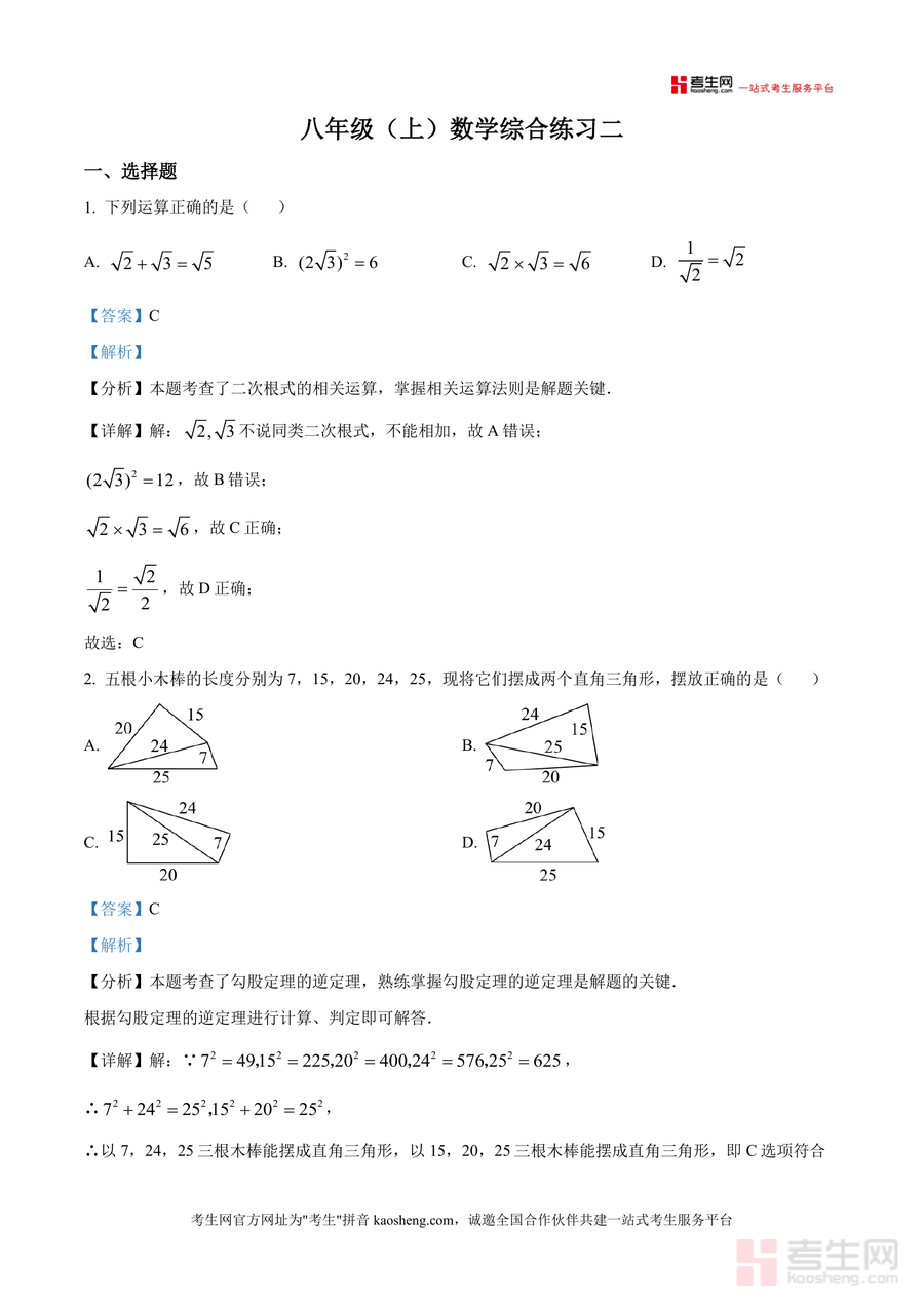 《精品解析:广东省深圳市宝安区宝安中学2025-2026学年上学期八年级数学第二次月考试卷(解析版).docx》是一份针对深圳宝安中学八年级数学第二次月考真题进行深度剖析专业备考资料。该资料涵盖选择题、填空题、解答题等完整题型,涉及二次根式运算、勾股定理逆定理、统计量计算(众数、中位数等)、一次函数图像性质、二元一次方程组应用等核心知识点。特色亮点在于每道题配备详尽解析,含考点分析、解题思路推导及易错点提示,帮助学生透过题目把握考点本质,兼具真题实战性与知识讲解性。