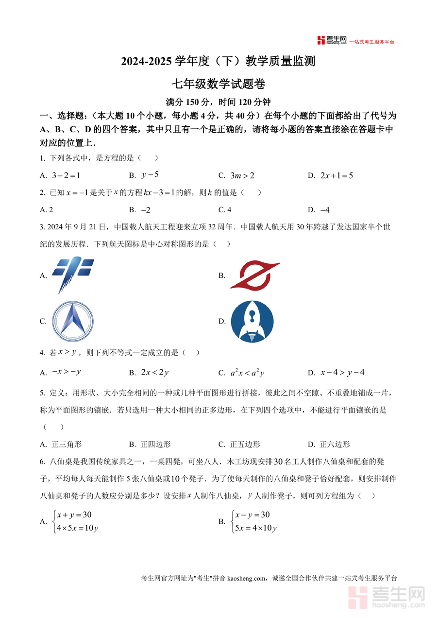 《精品解析:重庆市万州区2024-2025学年七年级下学期期末质量监测数学试题(原卷版).docx》是一份针对重庆市万州区七年级下学期数学期末质量监测设计的优质备考资料原卷资源。该文件包含完整试卷结构与题型设置:满分150分、考试时长120分钟;题型涵盖选择题(10小题共40分)、填空题(6小题共24分)及解答题(9小题共86分)。内容覆盖代数方程与不等式求解、平面几何图形性质与变换、多边形镶嵌、实际应用问题等核心知识点,题目设计贴合区域教学大纲要求,能真实还原本地期末监测命题风格与难度梯度。