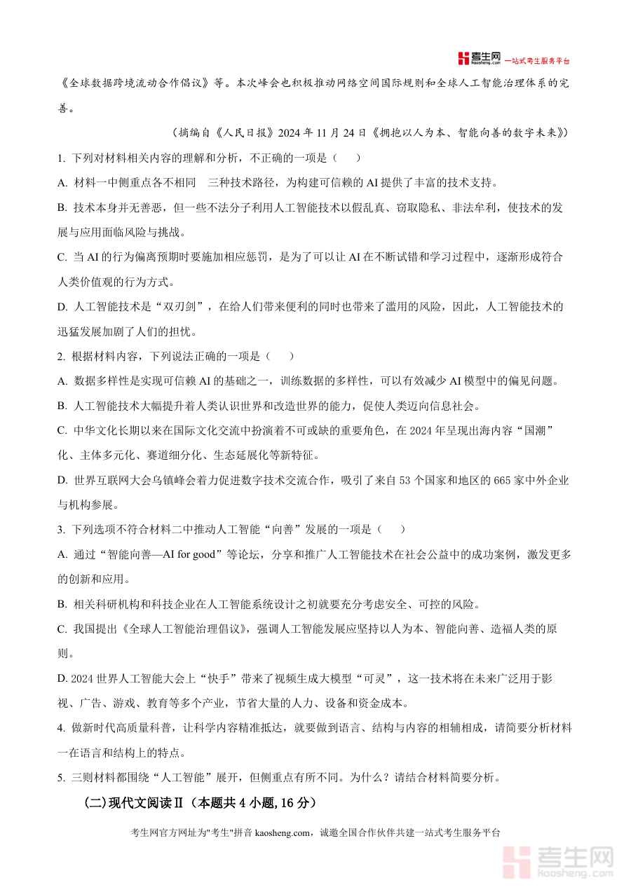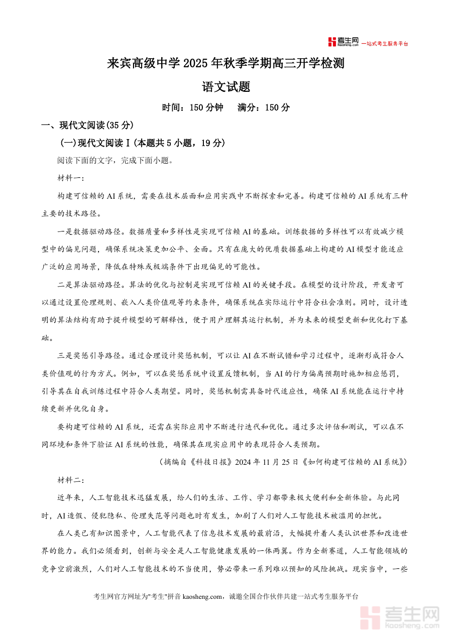 《精品解析:广西壮族自治区来宾市高级中学2025-2026学年高三上学期开学检测语文试题(原卷版).docx》是一份聚焦高三语文开学阶段学情诊断与应试能力提升的专业备考资料。该资料严格遵循高考语文命题框架与本地教学实际需求,涵盖现代文阅读(含论述类文本与文学类文本两大模块)等核心题型板块,试题设置贴合高考考点分布:论述类文本围绕"可信赖AI系统构建""负责任人工智能发展"等前沿议题展开考查,搭配选择题与主观题检验信息整合能力;文学类文本选取散文《黄姚酿》,通过多维度题目评估审美鉴赏与文本解读能力;整体题型结构完整且难度梯度合理,兼具诊断性与训练价值,为后续复习提供精准参考依据,助力学生快速适应高三备考节奏。