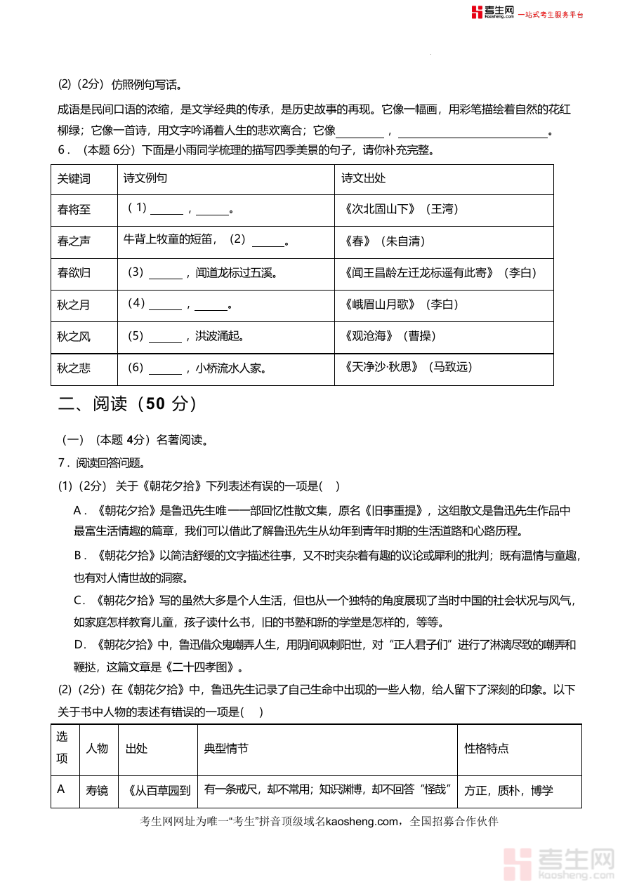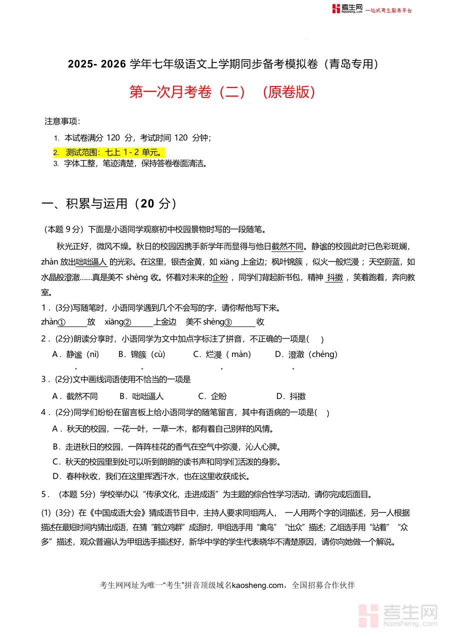 《【青岛专用】第一次月考卷(二)-2025-2026学年七年级语文上学期同步备考模拟卷(统编版2024)(原卷版).docx》是一份针对青岛市七年级学生设计制作语文备考资料,聚焦七上1-2单元核心知识点,涵盖积累与运用及阅读两大模块,包含汉字书写、拼音辨析、词语运用等基础题型,以及名著阅读(《朝花夕拾》)、诗词鉴赏(杜甫《江南逢李龟年》)、文言文阅读(《陈太丘与友期行》等)和现代文阅读(候鸟迁徙主题等)等综合题型,全面覆盖教材重点内容,具有青岛地区命题特色,能有效检验学生的语文基础与综合运用能力,为第一次月考提供针对性训练素材。