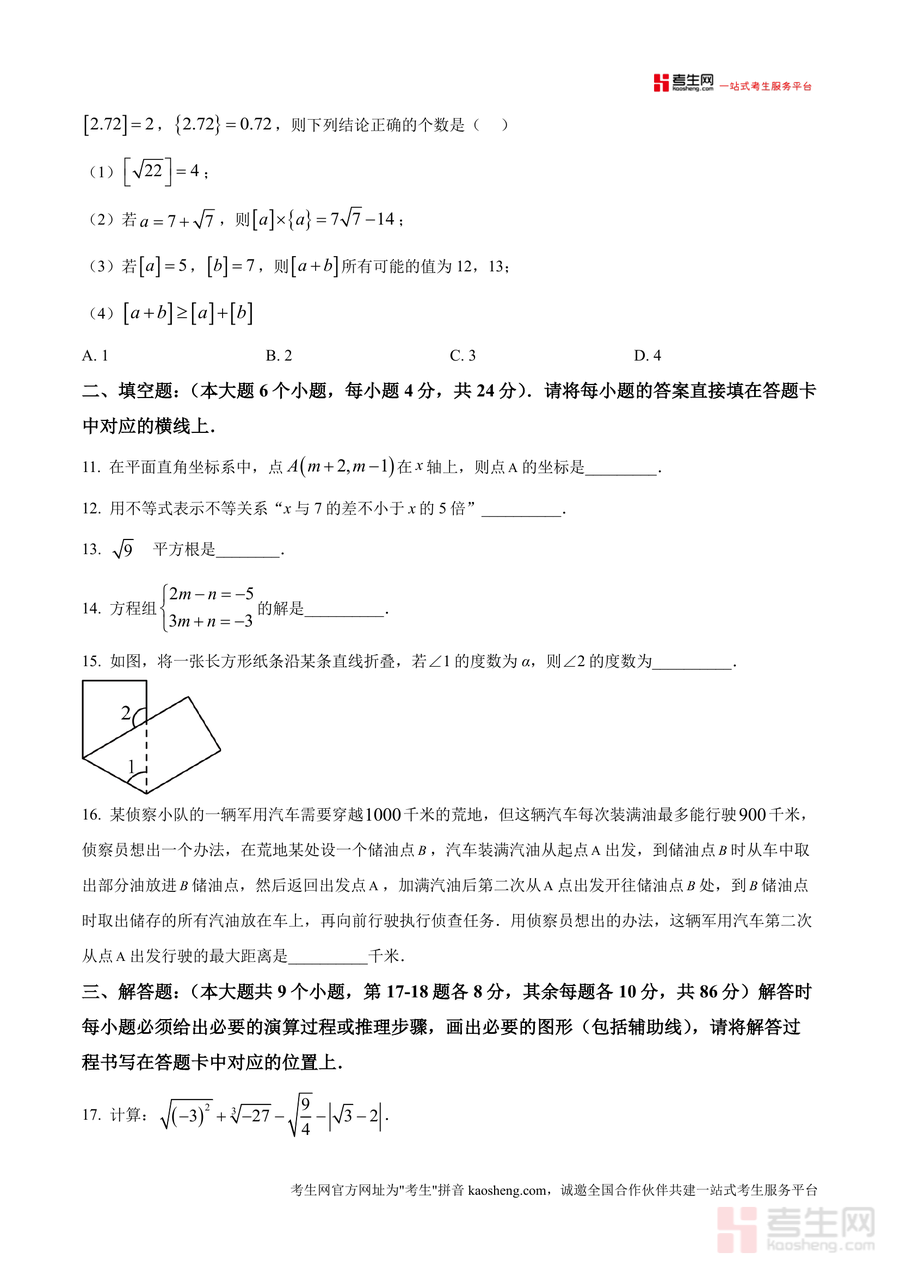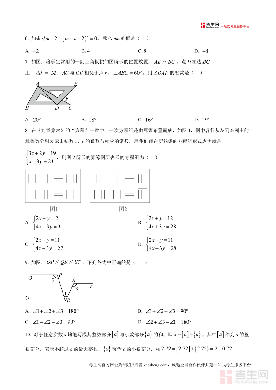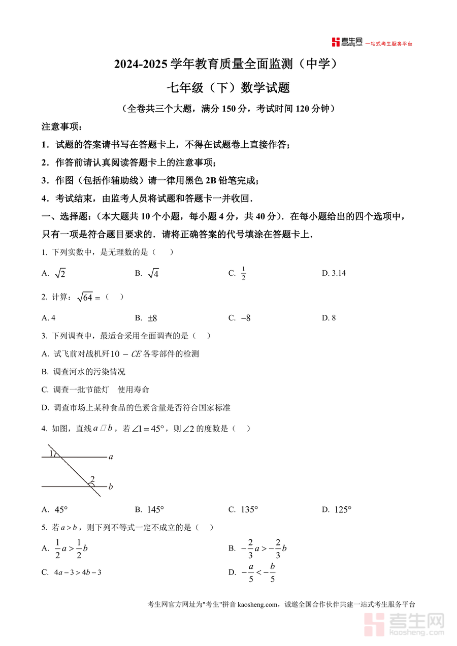 《精品解析:重庆市九龙坡区2024-2025学年七年级下学期期末数学试题(原卷版)》是一份针对当地七年级下学期数学期末备考的权威真题资料,严格遵循2024-2025学年教育质量全面监测标准编制。全卷共三个大题,满分150分,考试时间120分钟,包含选择题(10小题)、填空题(6小题)、解答题(9小题)三大题型模块,覆盖实数概念、代数运算、几何图形性质、统计调查方法、方程组与不等式组等七年级下册核心知识点。该资料以原卷形式完整呈现考试注意事项及题型结构细节,保留原汁原味的命题风格与考查维度,是兼具权威性与实用性的备考资料。