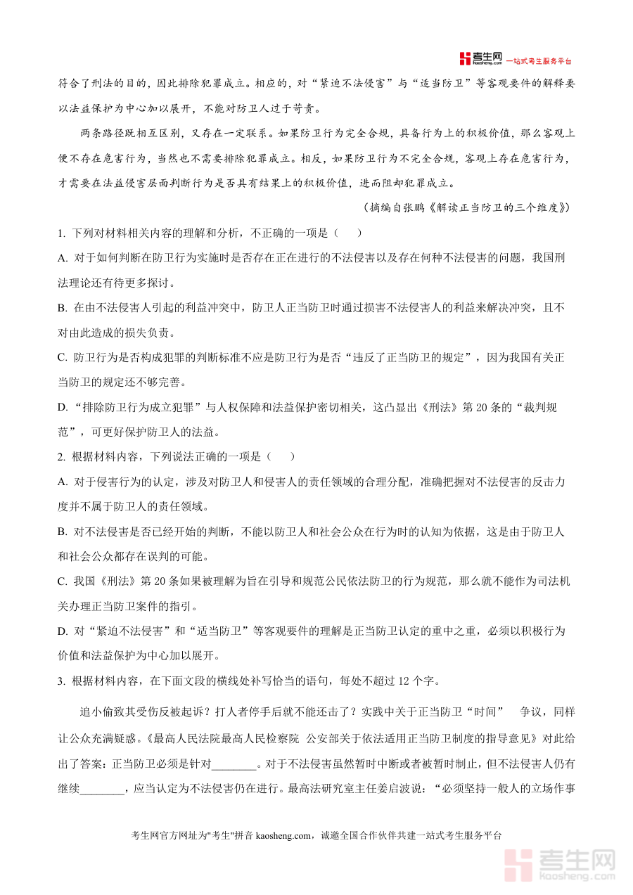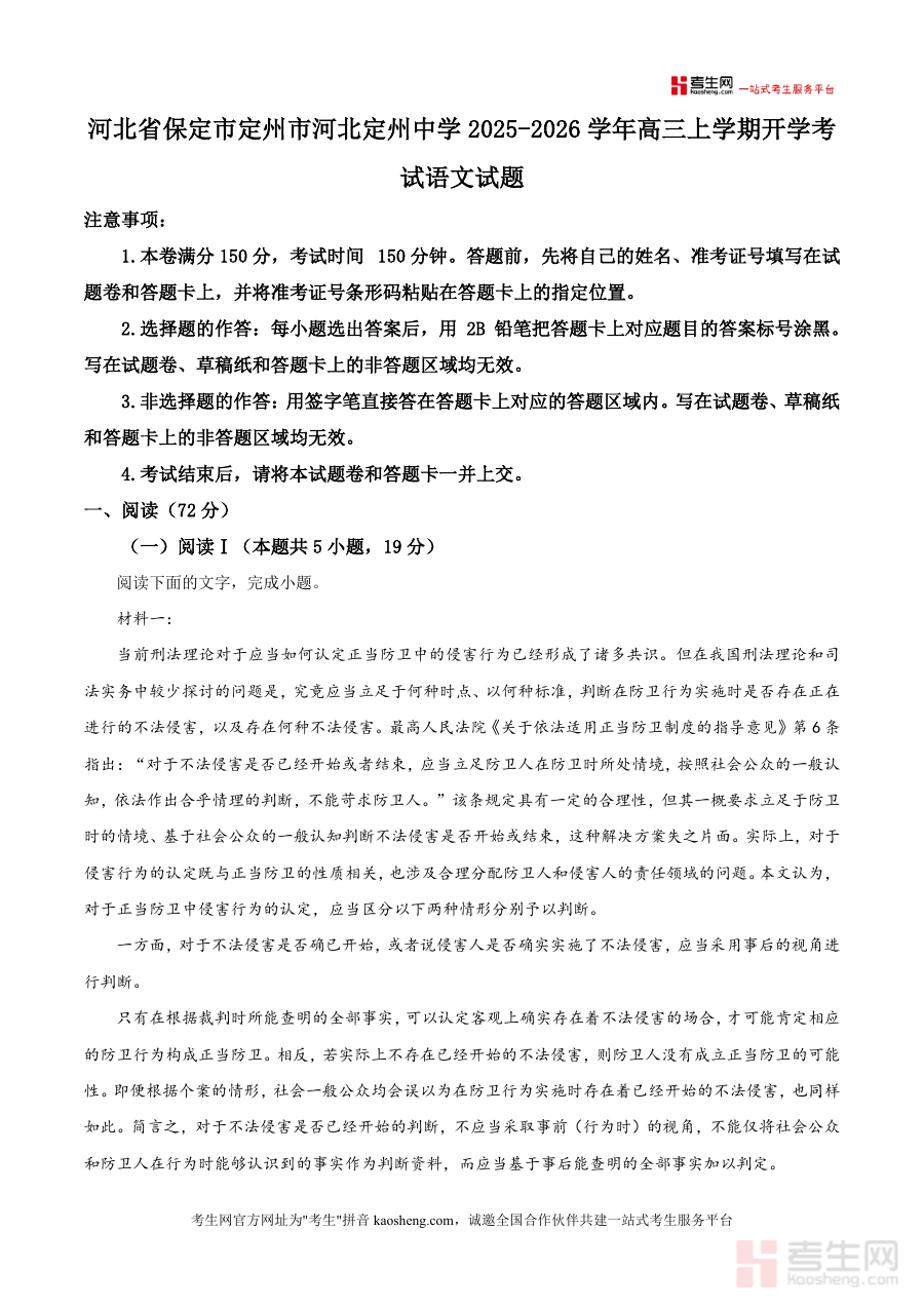 《精品解析:河北省保定市定州市河北定州中学2025-2026学年高三上学期开学考试语文试题(原卷版).docx》是一份聚焦高三学生语文学习阶段性评估与备考提升需求的专业备考资料,主要内容包含考试注意事项及规范要求、阅读题(含社科类文本《如何认定正当防卫中的侵害行为》《解读正当防卫三个维度》与文学类文本《远大前程》节选)、选择题、补写语句题及论证分析题等高考核心题型模块;其特色亮点在于严格贴合河北定州中学教学实际与高考考点布局,题型设置全面覆盖语文核心素养考查维度,并以真题原卷形式完整保留真实考试情境与命题风格,为学生提供沉浸式训练体验。