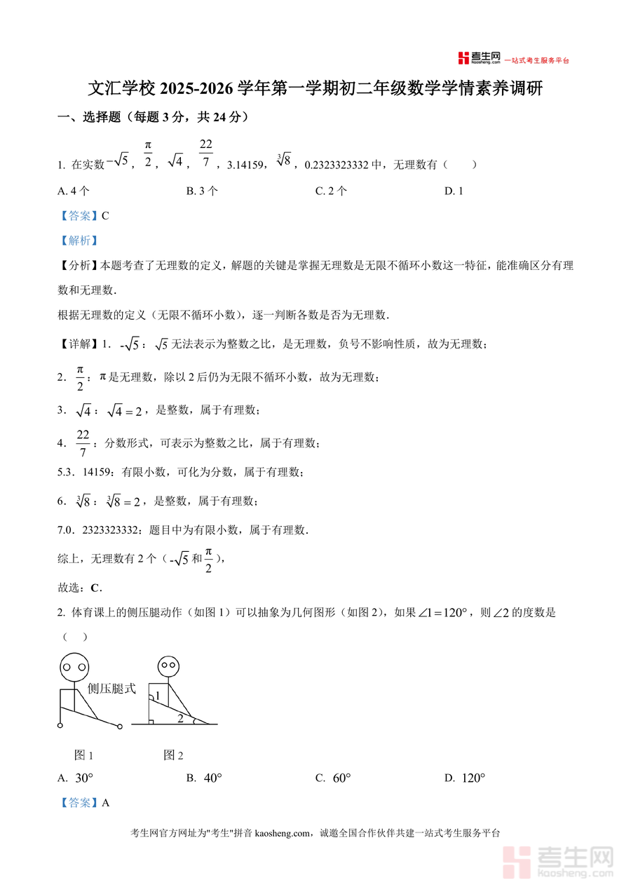 《精品解析:广东省深圳市宝安区文汇学校2025-2026学年上学期八年级数学学情素养调研(解析版).docx》是一份针对深圳宝安区文汇学校八年级上学期数学学情调研的专业真题解析资料,涵盖选择题、填空题、解答题全题型详细解析。资料以每道题为单位展开核心考点剖析——如无理数定义区分、二次根式运算验证、全等三角形判定应用等内容,并融入错因分析与解题技巧总结两大特色,深度结合真题解析与应试能力提升需求,助力用户精准掌握数学核心知识。