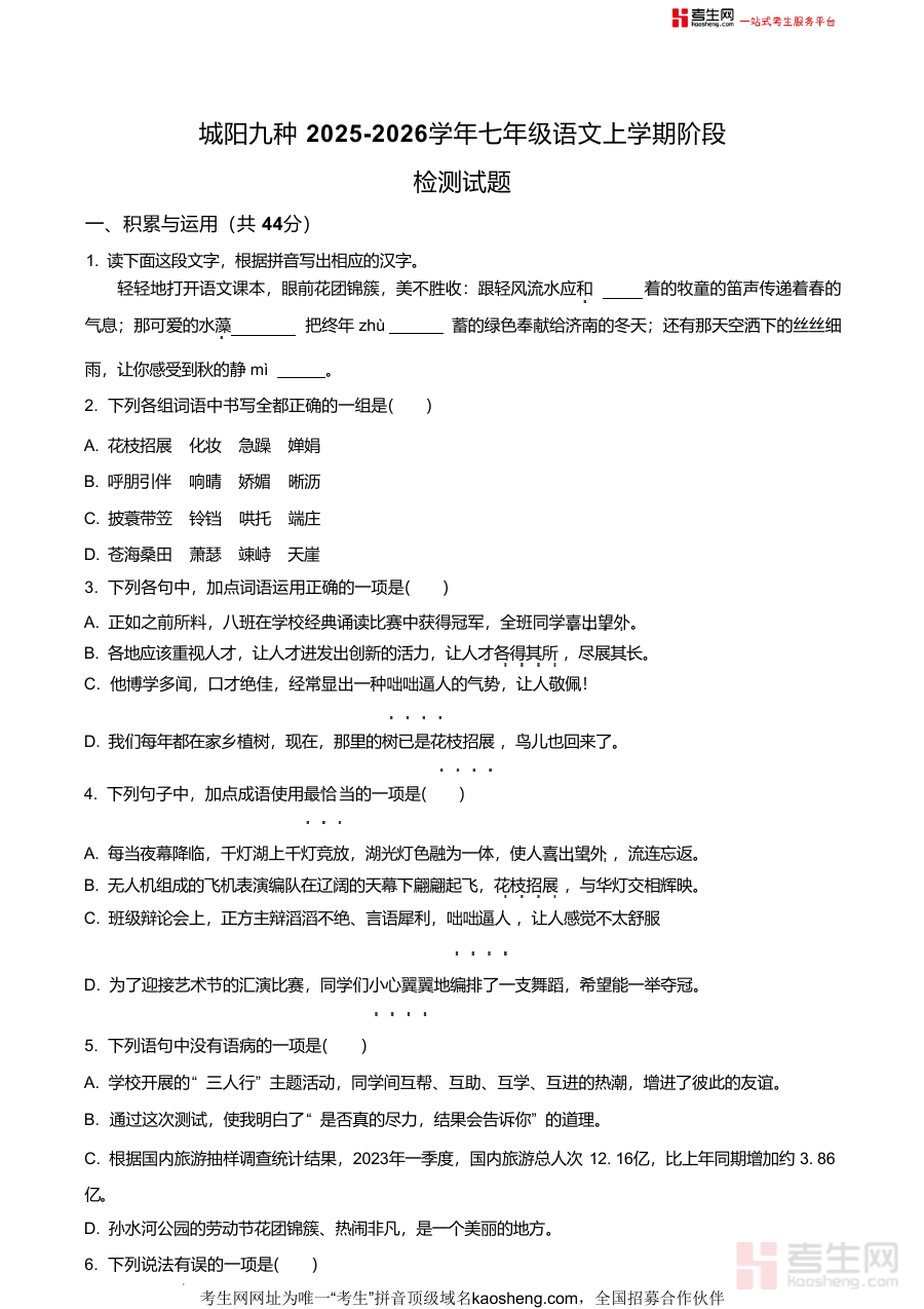 《精品解析:山东省青岛市城阳第九中学2025—2026学年七年级上学期10月月考语文试卷(原卷版).docx》是一份针对七年级上学期语文阶段性检测的本地化真题资料,聚焦城阳九中教学进度与命题特点,涵盖积累与运用(字音字形、词语辨析、病句修改、文学文化常识等)、古诗文填空与赏析、名著阅读(《朝花夕拾》相关考点)、文言文阅读(《咏雪》《陈太丘与友期行》经典篇目)及现代文阅读(记叙文《母亲的味道》)等核心模块,题型设置贴合初中语文月考常规结构,能全面反映七年级上学期前半段知识掌握要求与能力考查方向,为学生提供真实的月考场景模拟素材,帮助快速熟悉本地考试题型与难度梯度。
