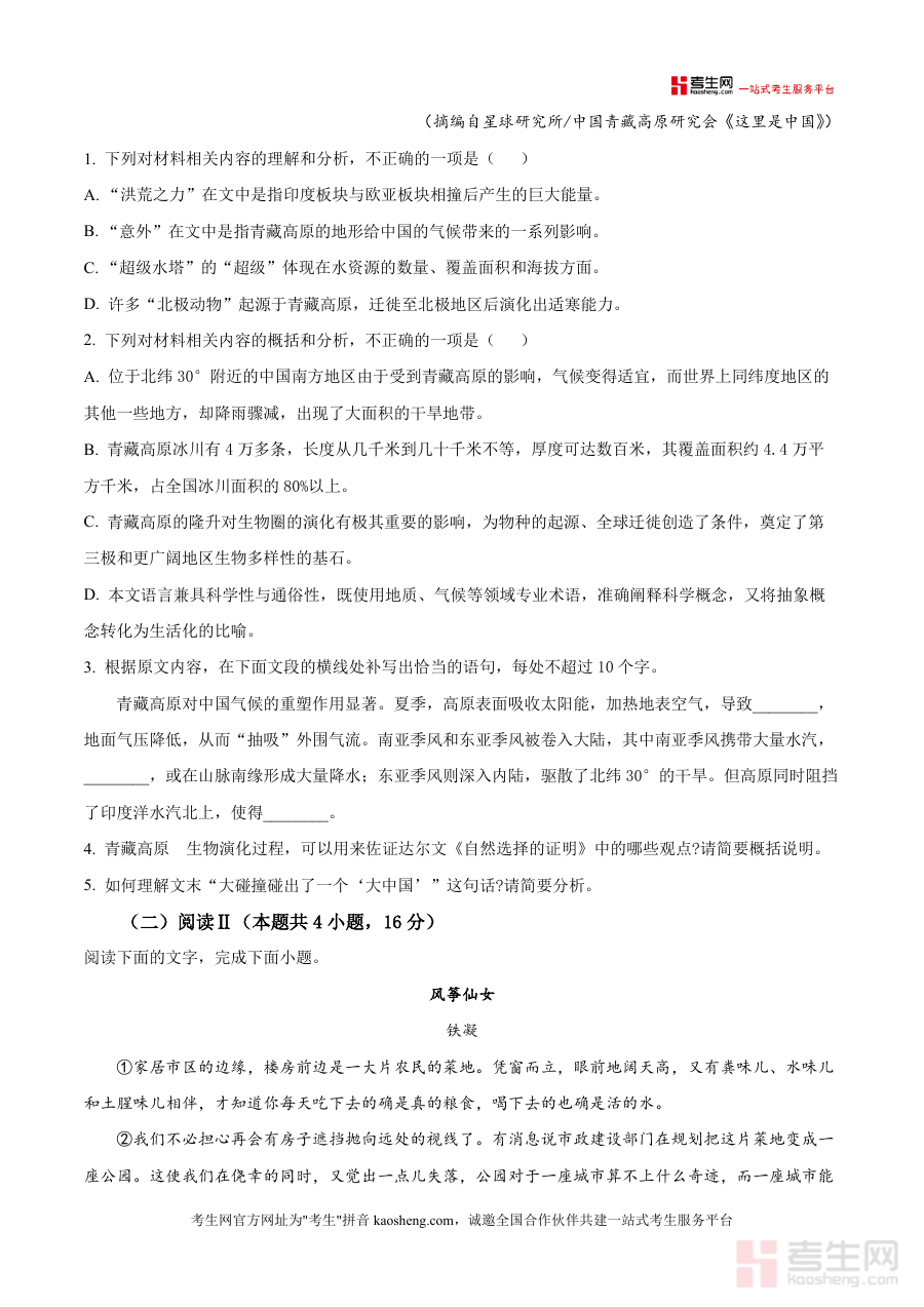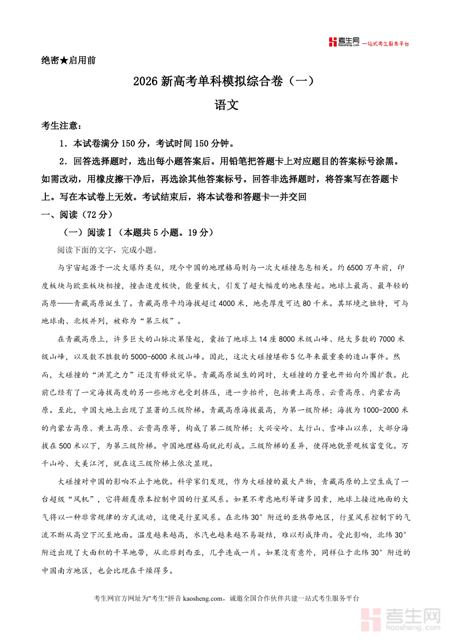 《精品解析:河北省秦皇岛市山海关区一中2025-2026学年高三上学期新高考单科模拟综合卷(一)语文试题(原卷版).docx》是一份聚焦高三学生新高考语文备考需求的松实型模拟资料,核心定位为贴合新高考命题规律的阶段性检测工具,主要内容覆盖论述类文本阅读(如选取青藏高原大碰撞对地理气候生物影响的科普材料)、文学类文本阅读(如铁凝《风筝仙女》等名家作品)及典型题型设置;特色亮点在于严格遵循新高考大纲,选材兼顾科学性与人文性,题型结构匹配新高考模式,助力备考资料体系构建与应试能力提升。