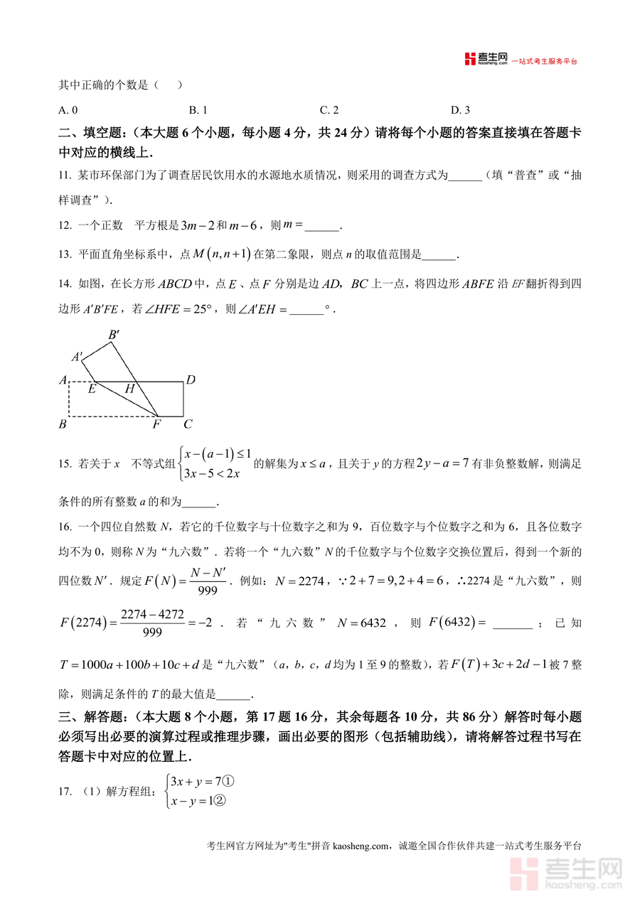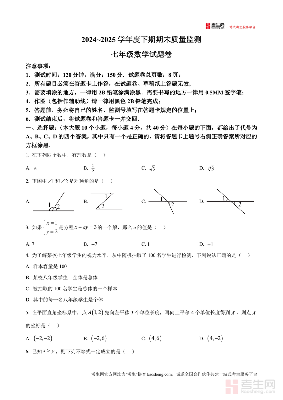 《精品解析:重庆市大足区2024-2025学年七年级下学期期末考试数学试题(原卷版).docx》是一份贴合区域教学实际、精准对接七年级下册数学核心考点的标准化期末测评资料。该资料严格遵循本地期末考试120分钟测试时长与150分满分设置,包含选择题(10小题40分)、填空题(6小题24分)、解答题(8小题86分)三大题型板块,覆盖有理数概念、对顶角判定、二元一次方程组解法、不等式组应用、平面直角坐标系变换等核心知识模块;题目设计融入《孙子算经》传统文化情境、航天日主题统计调查等素材,既符合课程标准要求又贴近本地教学进度与命题趋势,兼具知识性与情境化特色。