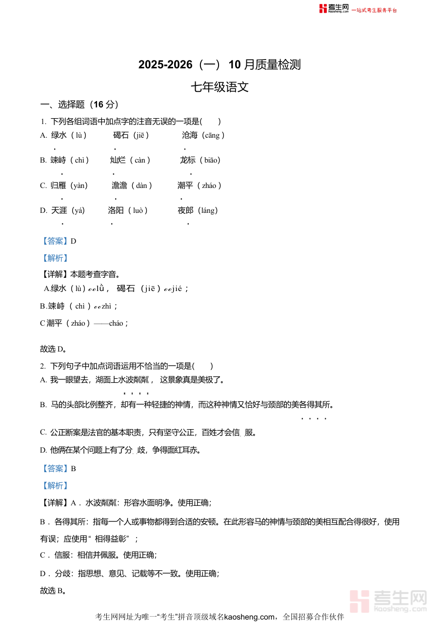 《精品解析:山东省青岛市市南区青岛超银中学2025-2026学年七年级上学期10月月考语文试题(解析版).docx》是一份精准匹配青岛超银中学七年级学情、聚焦阶段性知识检测需求真题解析类备考资料该资料全面覆盖字音字形辨析、词语运用判断、朗读节奏与重音标注、文言虚词实词及断句分析、古诗鉴赏、名句默写、文言翻译、综合性学习等题型特色亮点在于逐题提供详实解析不仅明确答案还深度剖析错误选项成因如字音题中对“碣石(jiē→jié)”“竦峙(chì→zhì)”等易错字注音纠正词语运用题里对“各得其所”误用场景分析同时融入知识点拓展如文言断句逻辑方法、古诗意象解读技巧助力学生理解命题思路与知识本质