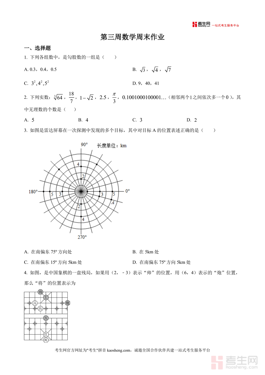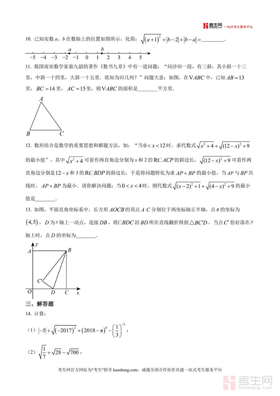 《精品解析:广东省深圳市新安中学(集团)第二外国语学校2025-2026学年八年级上学期第三周周测数学试卷(原卷版).docx》是一份针对八年级上学期数学阶段性学习的校考真题备考资料,核心定位为反映学生第三周知识掌握情况的检测工具。主要内容覆盖勾股定理应用(如勾股数判断、几何图形中的勾股定理计算)、实数分类与运算(无理数识别、平方根立方根求解)、平面直角坐标系综合应用(点坐标表示、对称点计算、图形面积求解)等核心模块;题型包含选择题、填空题及解答题三大类共23道题目,并融入秦九韶“三斜求积”等数学文化元素。特色亮点在于贴合深圳本地校考命题趋势,真实还原考试情境,并覆盖高频考点,为学生提供精准的阶段性学习反馈依据。