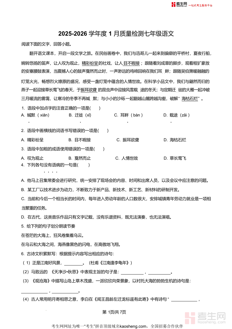 《精品解析:山东省青岛市市南区青岛超银中学2025-2026学年七年级上学期1月月考语文试题(原卷版).docx》是一份针对该学段阶段性检测的权威备考资料,涵盖基础字词辨析(注音、书写正误判断)、成语运用分析、病句修改、古诗文积累默写(含杜甫《江南逢李龟年》等经典篇目)、名著阅读考查(《朝花夕拾》《西游记》核心知识点)、文言文对比阅读(《狼》与《阅微草堂笔记》选段)、现代文阅读及诗歌鉴赏等题型,全面覆盖七年级上学期语文核心考点,贴合青岛超银中学教学进度与本地考试命题特色,但这里需要注意原文没有解析部分,但整体是原卷呈现,具有较高权威性与实用性。