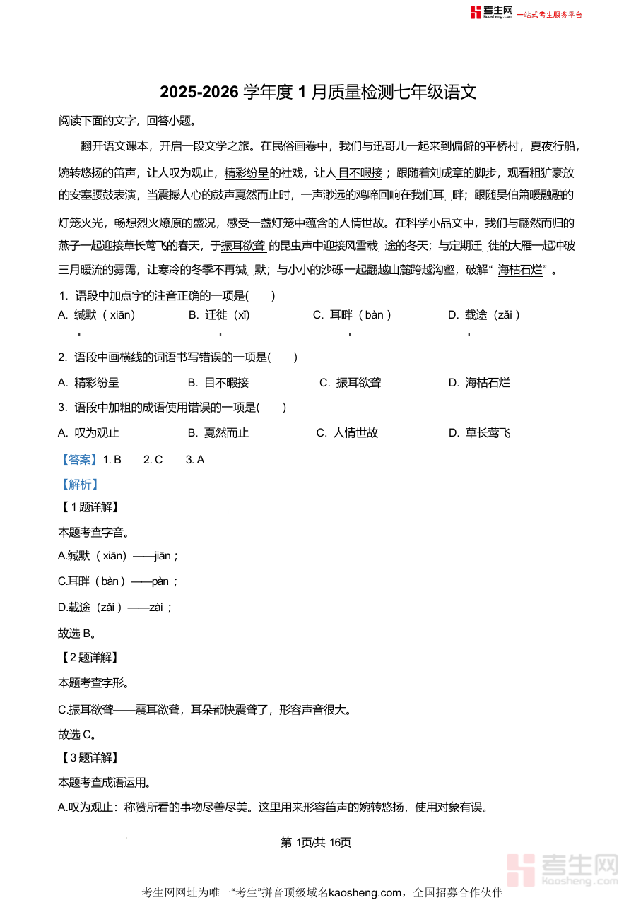 《精品解析:山东省青岛市市南区青岛超银中学2025-2026学年七年级上学期1月月考语文试题(解析版).docx》是一份针对该校七年级上学期1月月考语文真题编制的专业解析资料,涵盖字音字形辨析、成语运用、病句修改、朗读节奏划分、古诗文积累默写、名著阅读(如《朝花夕拾》《西游记》)及诗歌赏析等核心题型;其特色亮点在于解析详实深入——不仅给出准确答案,还逐一分析错误选项成因(如字音题纠正"缄默xiān"为"jiān")、提供答题思路(如朗读节奏划分依据语法结构与语义表达),并结合课本内容强化知识点关联,帮助学生构建完整知识体系。