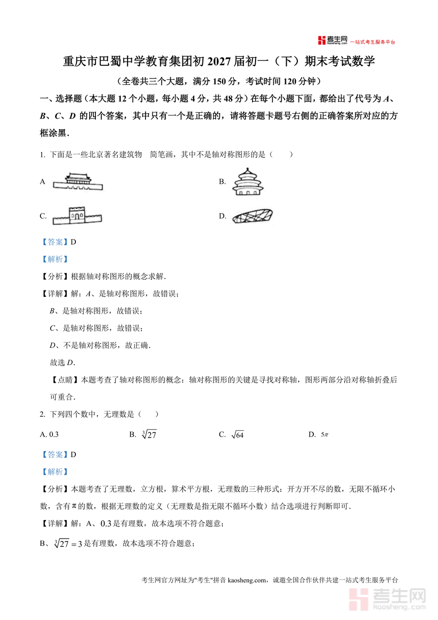 《精品解析:重庆市巴蜀中学2024-2025学年 七年级下学期期末数学试题(解析版).docx》是一份依托巴蜀中学优质教研资源打造、针对七年级下学期数学期末真题展开专业备考资料。文件包含全卷三个大题(选择题12道、填空题8道及后续解答题)完整解析,每道题均配备考点分析、详细解题步骤及易错点提示,例如选择题中对轴对称图形概念精准解读、无理数判断方法归纳等,能帮助使用者快速把握题目背后核心知识。其特色在于解析逻辑清晰且贴合学生认知水平,既注重基础概念巩固,又突出解题技巧提炼,为真题解析类资料提供高质量范本。