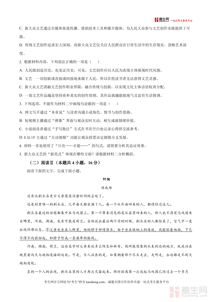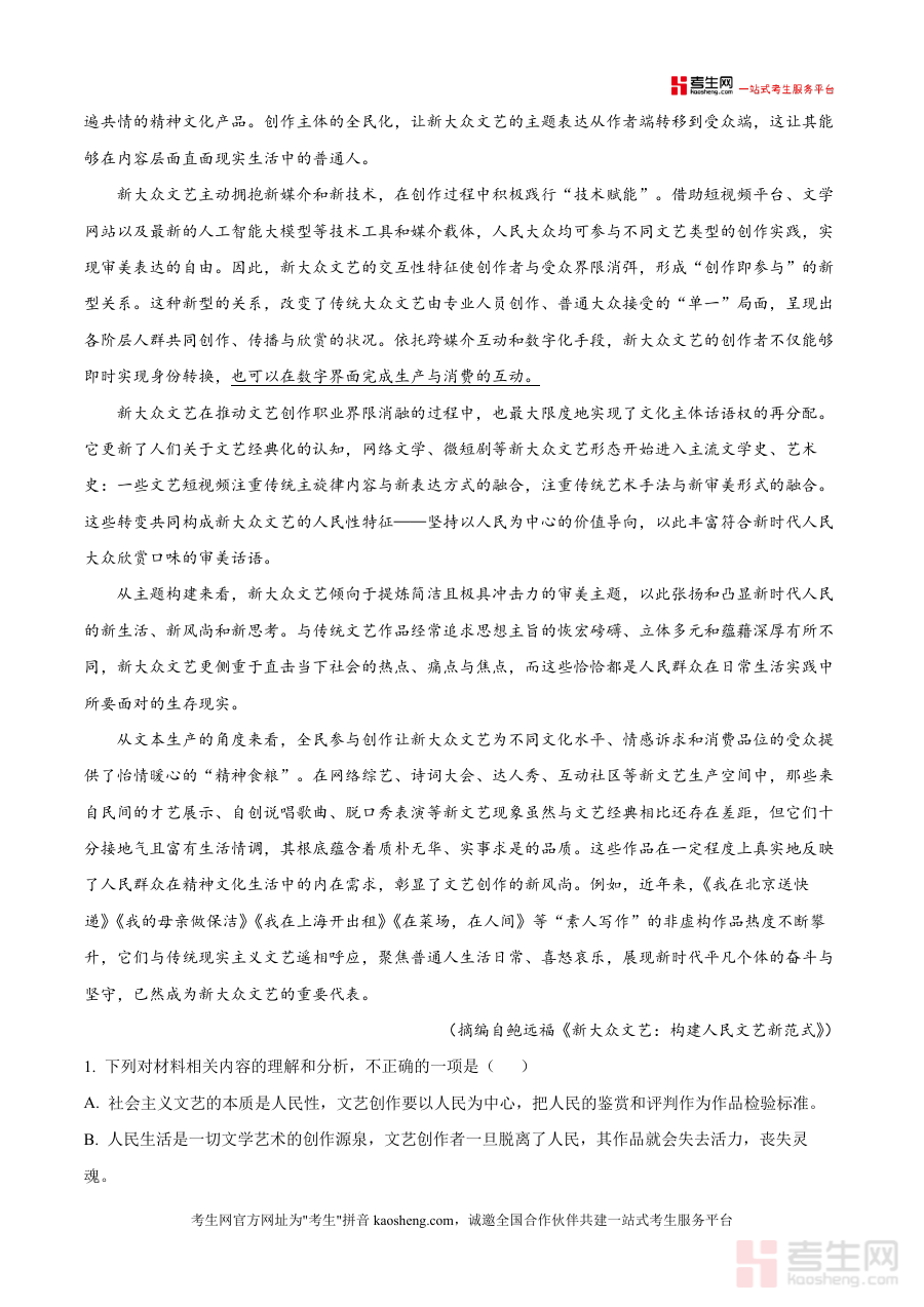 《精品解析:湖北省荆州市沙市中学2025-2026学年高三8月月考语文试题(原卷版).docx》是一份面向高三学生的优质语文备考资料及真题解析文件,核心定位为高三开学初期阶段的实战型检测工具与复习参考依据。其主要内容涵盖完整语文试题原卷(含阅读Ⅰ中关于社会发展阶段文艺与新大众文艺理论材料、阅读Ⅱ中文学作品《阡陌》等经典文本及对应客观题与主观题设置);特色亮点在于紧密贴合荆州市沙市中学教学进度与高考命题趋势,试题设计兼顾基础知识考查与高阶思维能力测评,解析部分注重答题思路引导与得分要点梳理,并融入对马克思主义文艺观等核心理论的深度解读,可有效帮助使用者理解考点逻辑与命题意图~