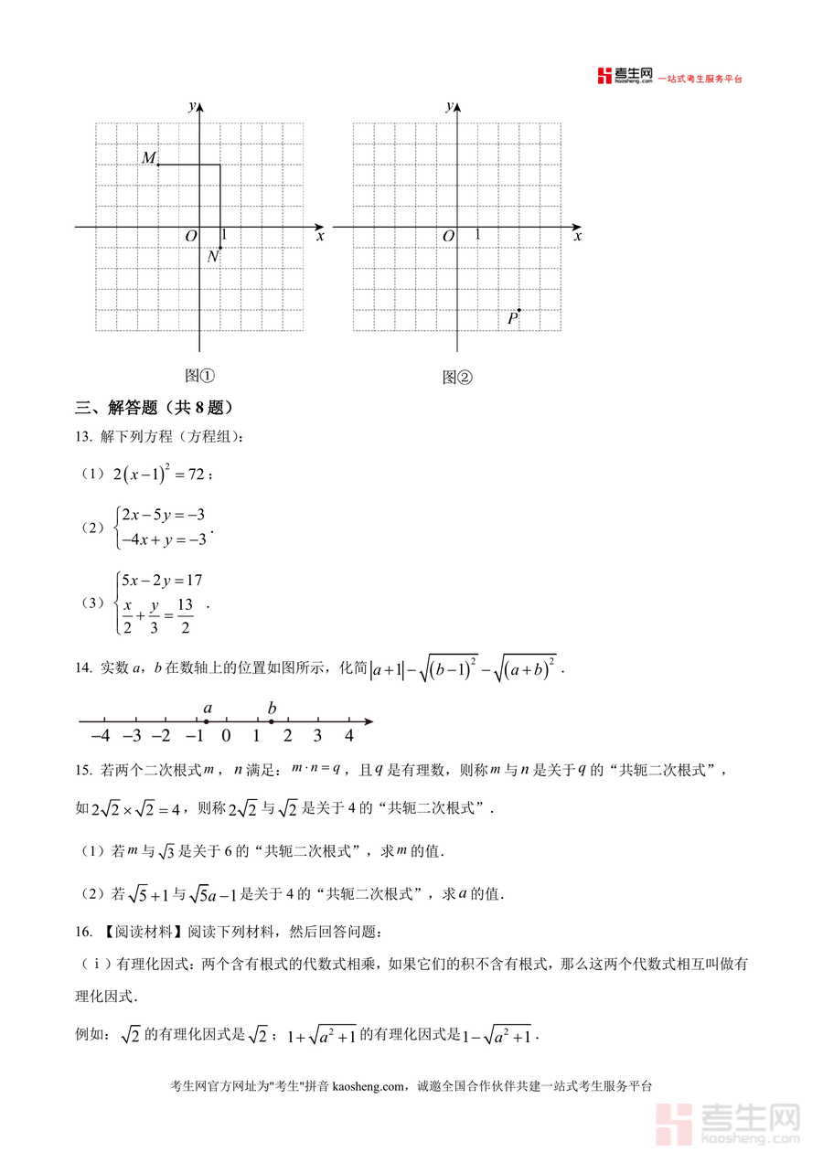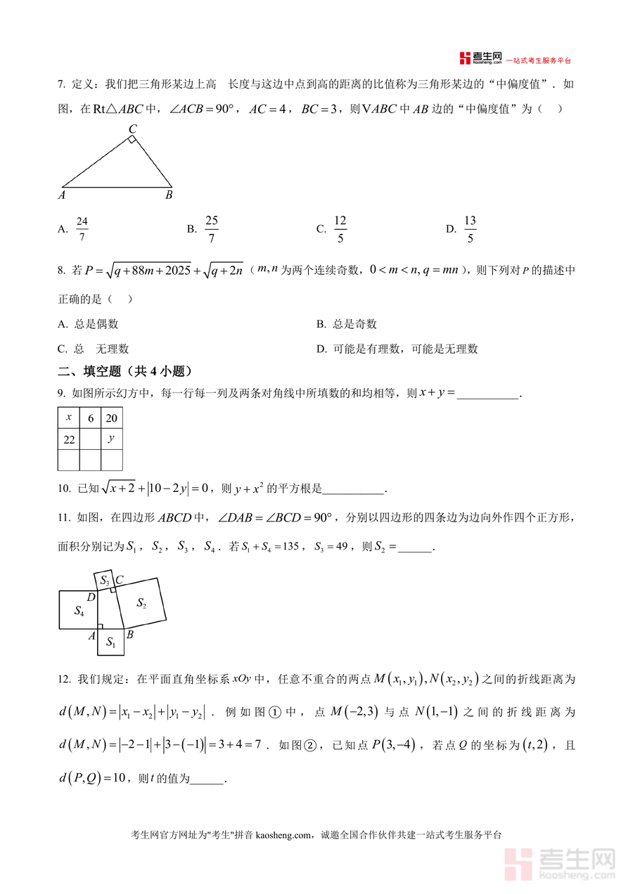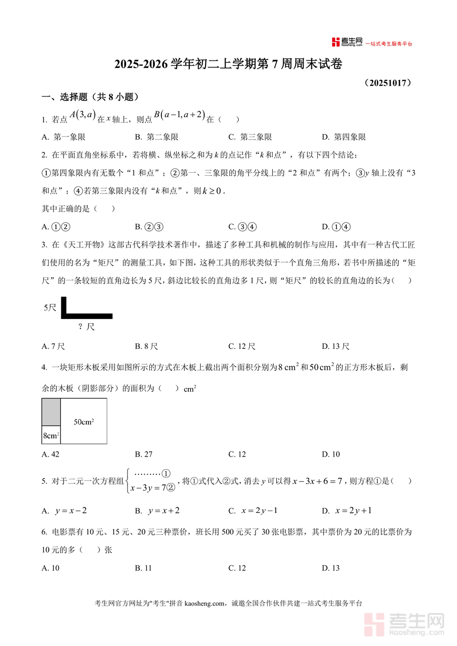 《精品解析:广东省深圳市深圳实验中学初中部2025-2026学年八年级上学期第七周周测数学试卷(原卷版).docx》是一份针对深圳实验中学八年级上学期第七周数学周测的官方原卷资料,主要内容涵盖平面直角坐标系(如“k和点”概念辨析、点坐标特征分析)、勾股定理(矩尺测量工具应用、矩形截正方形剩余面积计算)、二元一次方程组代入消元法、幻方规律、平方根运算、分母有理化等核心知识点;特色亮点在于严格遵循该校教学进度与考核标准,题型设置兼顾基础巩固与能力拓展,包含选择、填空、解答三大模块共20道题(8选4填8解答),全面覆盖当期教学重点,精准反映该校数学教学方向与考核要求。