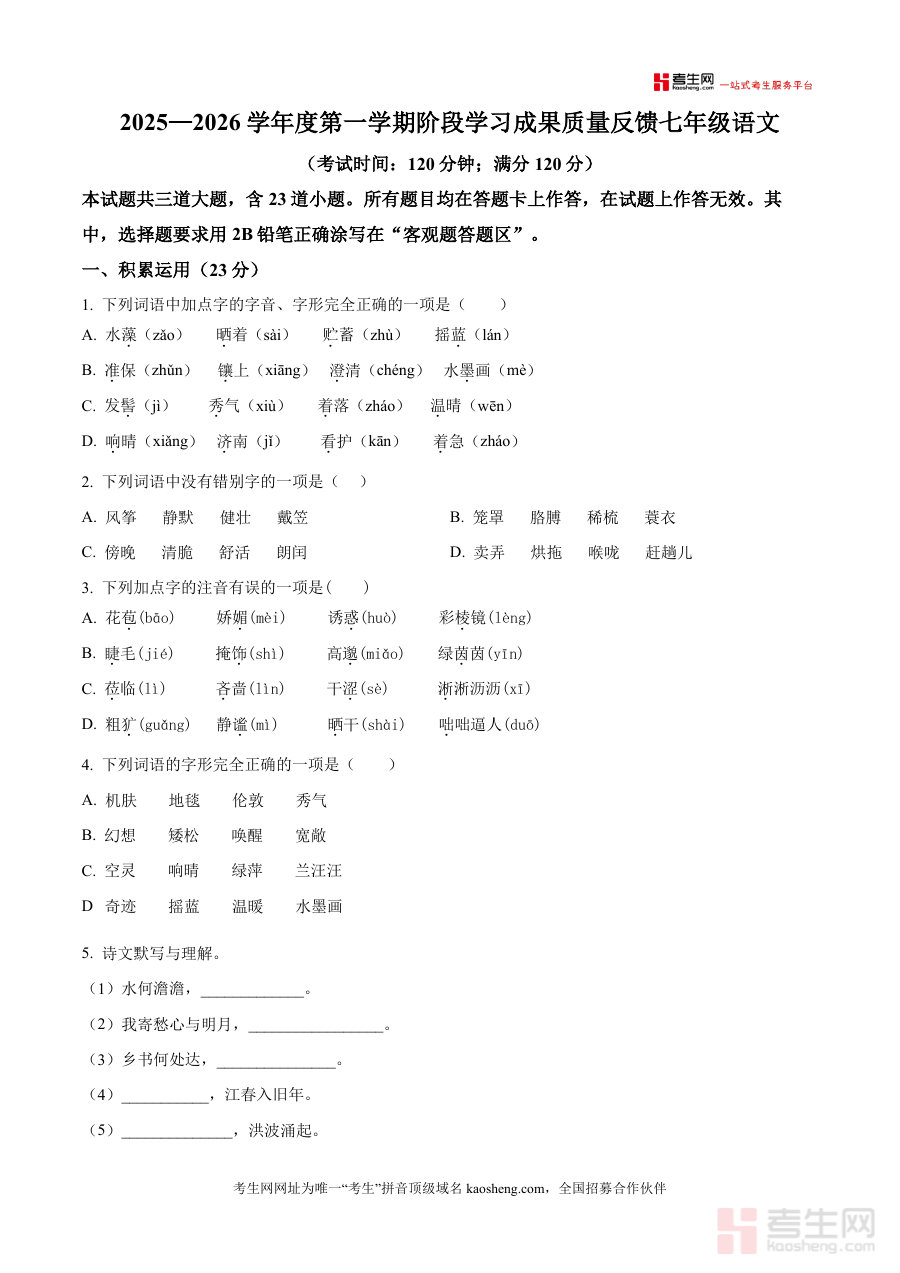 《精品解析:山东省青岛市某校2025-2026学年七年级上学期10月月考语文试题(原卷版)(1).docx》是一份针对七年级上学期语文阶段性考试的优质备考资料,完整呈现该校10月月考语文真题原卷,涵盖积累运用、诗歌阅读、名著阅读、文言文阅读及现代文阅读五大核心模块,题型设置贴合初中语文教学大纲要求,题目难度梯度合理,能真实反映学生阶段性学习成果。资料以原卷形式呈现,保留考试时间(120分钟)、满分(120分)等细节,确保内容权威性与实用性,为学生提供贴近真实考试场景的数据支撑,助力高效备考。