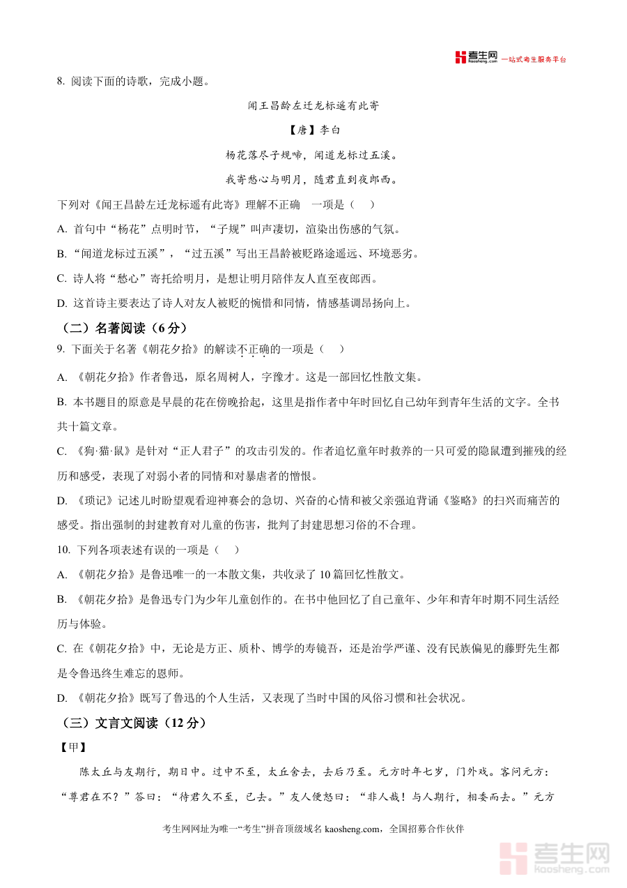 本资料适用于山东省青岛市及周边地区七年级学生、初中语文教师及关注孩子语文学习进展的家长;其必要性在于贴合学期教学进度,填补阶段性真题资源空白,帮助学生查漏补缺;不可替代性体现在原卷版呈现形式,保留考试原汁原味;长期价值则是积累答题经验,培养规范答题习惯,为后续期中、期末考试及中考语文学习奠定坚实基础,具有较高参考价值与实用意义。