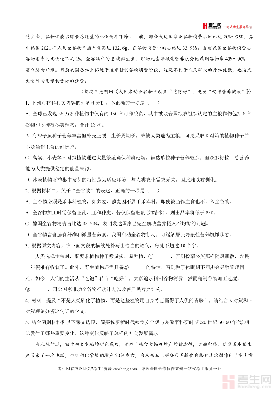 该资料核心用途为高三学生自我检测与知识漏洞定位、教师教学诊断与考点分析依据;使用场景包括学生自主刷题提升应试能力(如通过完成阅读题训练信息提取与文本解读能力)、教师课堂讲评与教学策略调整(如针对选择题错误率分析学生薄弱环节);用户价值在于借助真题原卷还原考试氛围,让学生提前适应高考答题节奏并掌握答题技巧;备考优势体现在其真题属性确保题型设置与难度梯度符合高考标准,能帮助学生高效巩固知识点,提升综合应试能力,为后续复习规划提供数据支撑.