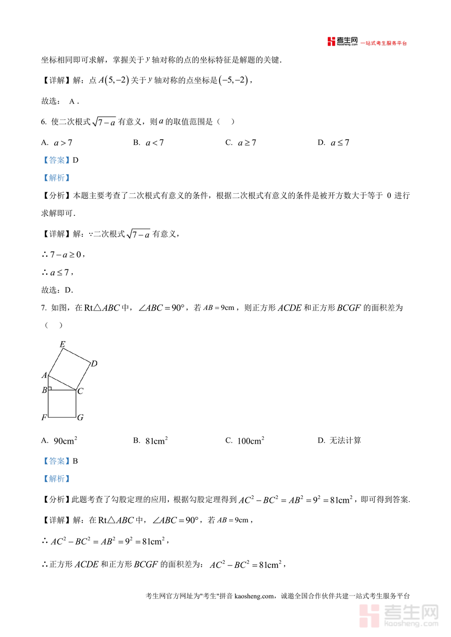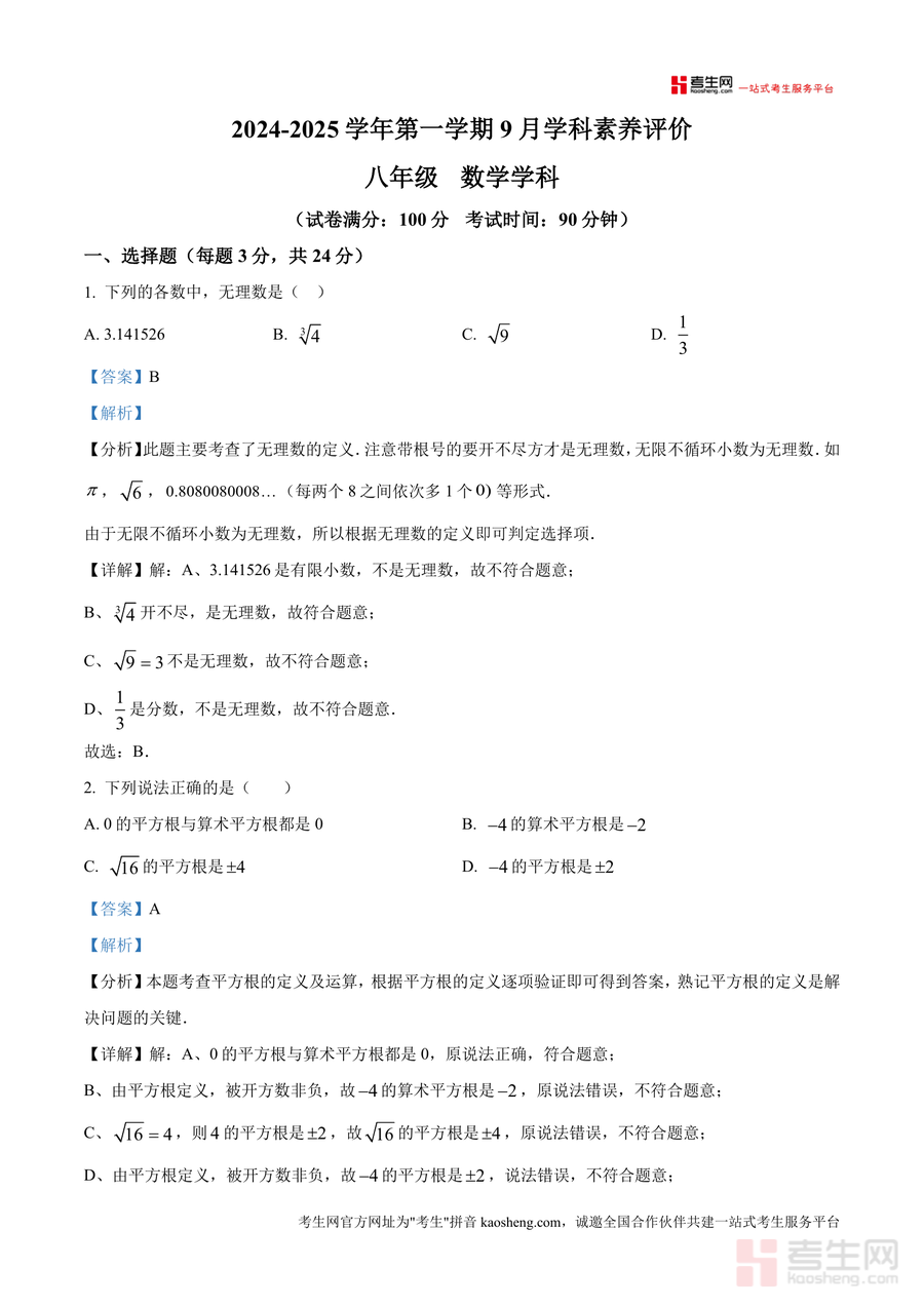 《精品解析:广东省深圳市深圳实验承翰学校2025-2026学年八年级上学期9月学科素养评价数学试卷(解析版).docx》是一份针对深圳实验承翰学校八年级上学期数学学科素养评价考试编写真题解析类备考资料。该资料包含完整试卷及详细解析,覆盖选择题(无理数判断、勾股数识别)、填空题(非负数性质应用)、解答题(二次根式运算、几何综合题)等全题型,涉及无理数定义、勾股定理及其逆定理等核心知识点。特色亮点在于解析融入考点分析、解题思路推导及易错点提示,如选择题第7题通过正方形面积差呈现勾股定理应用场景,解答题第16题结合实际问题强化知识迁移,契合学科素养评价导向。