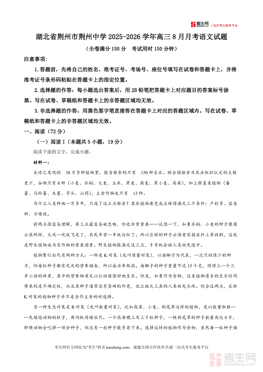 《精品解析:湖北省荆州市荆州中学2025-2026学年高三8月月考语文试题(解析版).docx》是一份聚焦高三语文备考需求的优质真题解析资料,依托荆州中学高三8月月考真题展开深度解读,覆盖阅读(含现代文阅读I/II、古诗文阅读)、语言文字运用及写作等全部题型。资料特色在于将真题内容与高考考点紧密结合,如针对现代文阅读中"植物生态对策""全谷物行动"等科普文本,不仅给出精准答案,还溯源考点(信息筛选整合、概念理解),并融入解题思路与技巧,助力学生高效掌握真题解析方法,提升应试能力转化效果。