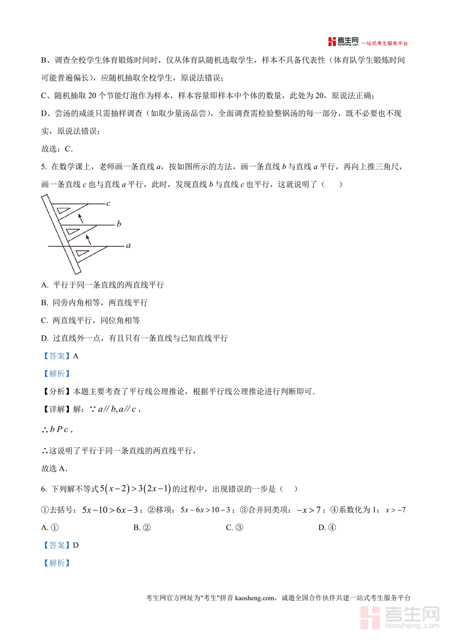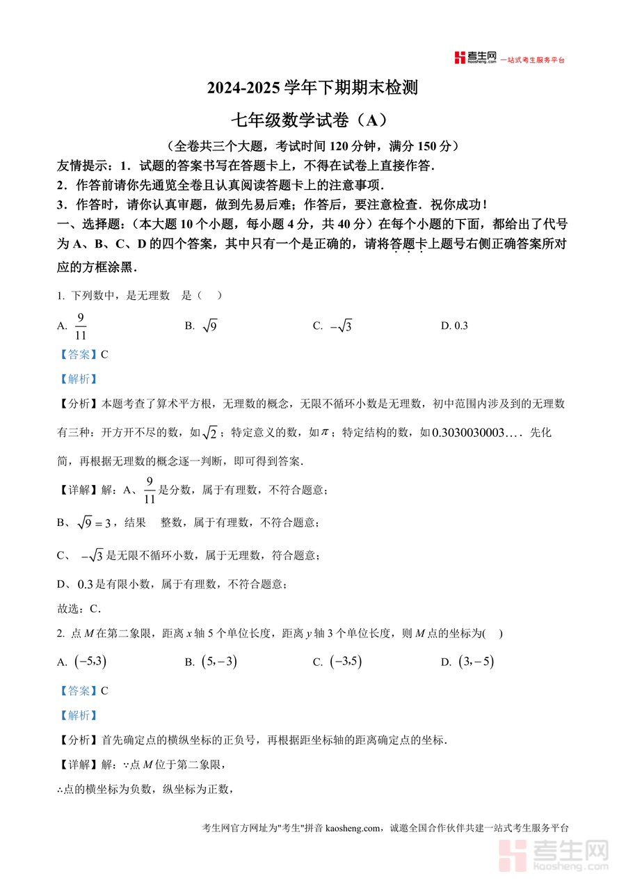 《精品解析:重庆市江津区2024-2025学年下期期末检测七年级数学试卷A卷(解析版).docx》是一份针对江津区七年级数学期末检测设计 的高质量真题解析资料,包含完整试卷结构(全卷三个大题、考试时长120分钟、满分150分)及每道题目的详细解析。其核心内容覆盖无理数概念、坐标点位置判定、统计调查原则等七年级下册数学核心考点;特色亮点在于解析中融入本地考情适配性分析、考点溯源及易错点提示——如选择题6针对解不等式时系数化为1未变不等号方向 的错误剖析,帮助使用者精准规避失分风险。