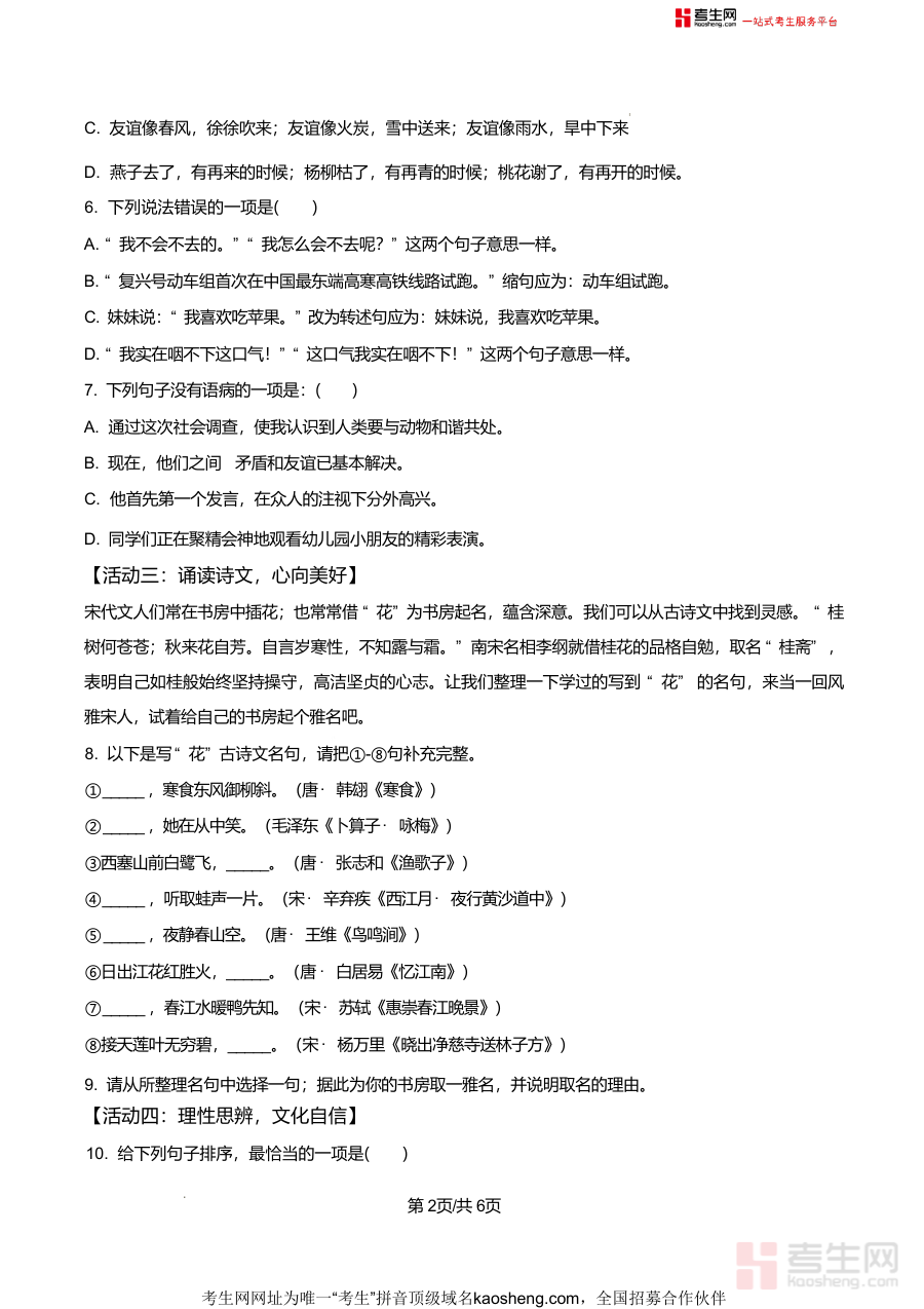 适用人群为即将升入青岛大学附属中学七年级的新生及其家长与辅导教师;该文件作为该校最新分班考试原卷资料具有不可替代参考价值是新生备考核心资料之一;通过系统练习不仅能提升分班考试成绩还能为后续初中语文学习奠定坚实基础培养良好学习习惯与思维方式对学生学业发展具有长期重要意义,是帮助学生顺利过渡到初中阶段学习并取得优异成绩的必备备考资源。