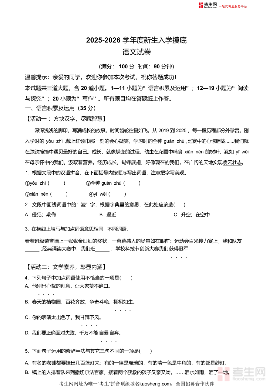 《精品解析:山东省青岛市青岛大学附属中学2025-2026年七年级上学期新生分班考试语文试题(原卷版).docx》是一份针对青大附中七年级新生分班考试的权威备考资料,包含完整原卷试题,结构清晰规范,涵盖语言积累及运用(如拼音汉字书写、词语辨析、古诗文填空等)、阅读与探究(材料阅读和文学作品阅读)、写作三大模块共20小题,特色在于贴合本地教学实际,题型全面且具有代表性,为考生提供真实的考试体验和精准备考方向,帮助学生快速熟悉分班考试内容与形式,并通过专业解析深化对考点知识掌握。