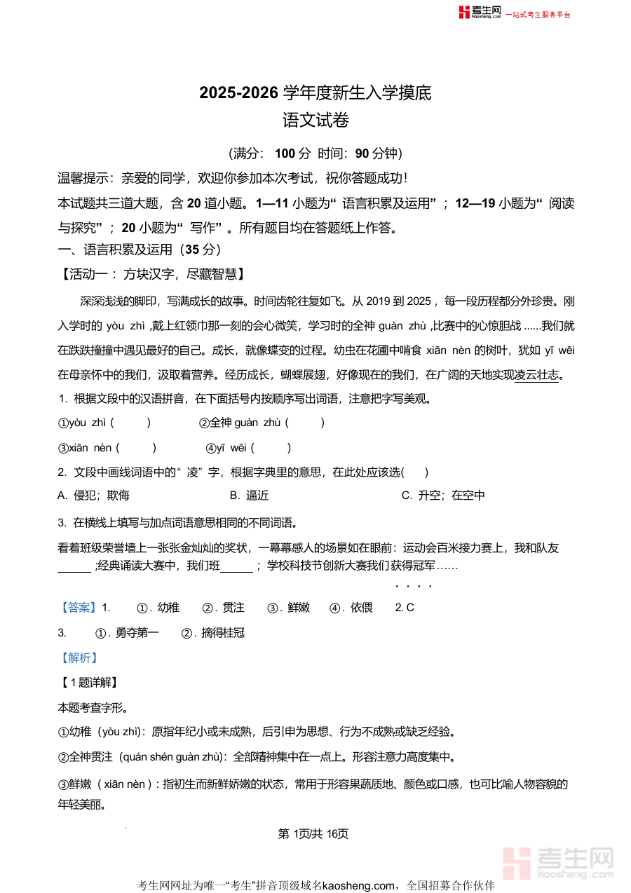 《精品解析:山东省青岛市青岛大学附属中学2025-2026年七年级上学期新生分班考试语文试题(解析版).docx》是一份针对该校七年级新生分班考试设计的专业备考资料,核心内容覆盖语言积累及运用(含字形辨析、字义理解、成语使用、修辞手法等)、阅读与探究(含古诗文默写应用、现代文阅读分析)及写作三大板块,严格贴合考试90分钟时长、100分满分的命题要求。其特色亮点在于每道题目均配备详实解析,如字形题明确汉字规范书写要点,成语题结合语境分析使用正误,古诗文题延伸文学素养解读,帮助学生理解考点背后知识逻辑,而非单纯记忆答案。