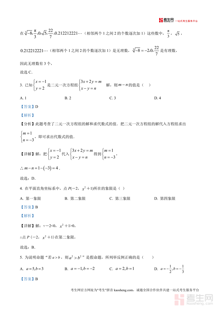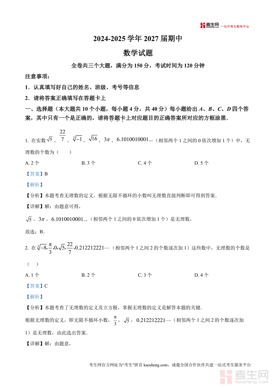 《精品解析:重庆市璧山区2024-2025学年七年级下学期5月期中四校联考数学试题(解析版)》是一份针对该区域七年级下学期数学期中备考阶段设计 的高质量真题解析类备考资料。资料包含全卷三大题(选择题10道、填空题6道、解答题8道)对应的完整解析内容,覆盖无理数识别、二元一次方程组解法、平面直角坐标系应用、平行线性质与判定等核心知识点。其特色亮点在于每个题目均配备清晰的考点分析(如无理数定义应用、方程组解代入技巧)、步骤拆解(从题干分析到答案推导 的完整流程)及易错提示(如象限坐标符号混淆点),同时融入思路拓展,帮助学生举一反三。