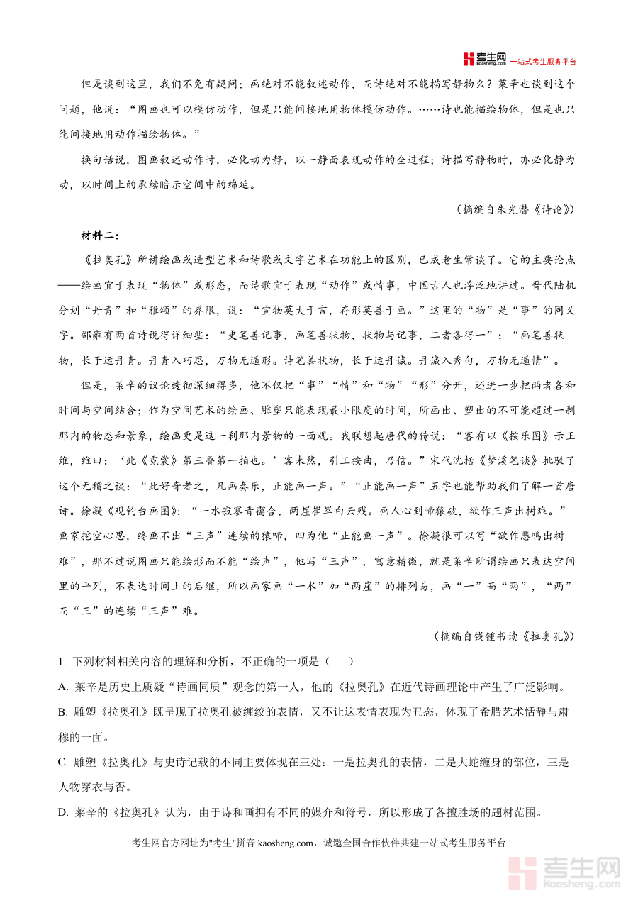 《精品解析:湖南省永州市一中2025-2026学年高三上学期开学检测语文试题(解析版).docx》是一份针对高三学生语文学科开学阶段知识掌握情况的精准检测与深度解析类备考资料,核心内容涵盖现代文阅读模块(含朱光潜《诗论》中莱辛《拉奥孔》诗画异质论、钱钟书相关延伸解读等经典文论材料)、完整试题设问及专业解析三大部分。资料特色亮点在于将抽象文学理论案例与高考应试考点有机结合,解析部分不仅给出标准答案,更对论证思路、选项正误逻辑、考点关联等进行分层拆解,帮助学生理解诗画异质等核心文论概念同时掌握解题技巧