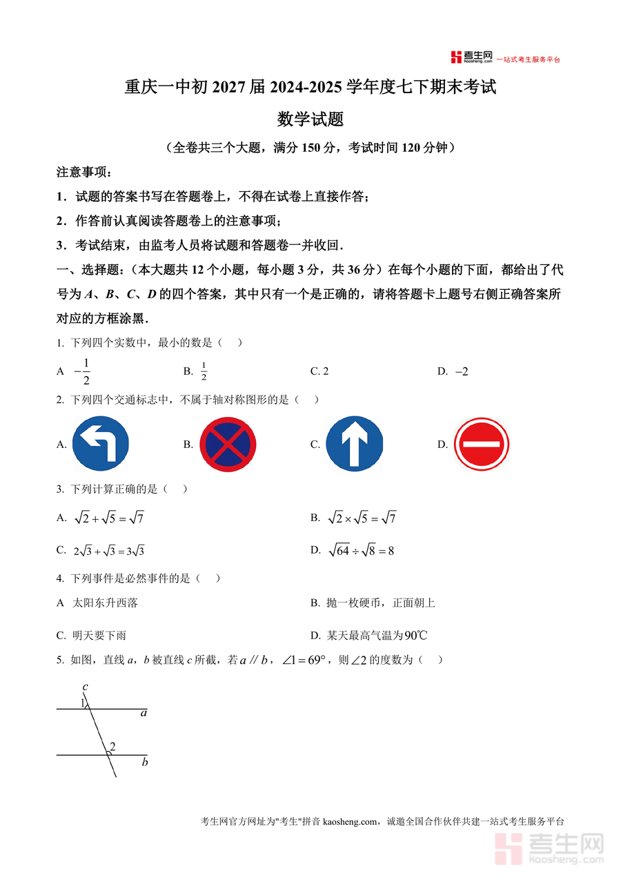 本资料适用于重庆一中初2027届及周边同类学校七年级学生、初中数学教师及备考辅导人员。作为重庆一中官方发布的期末真题原卷,它具有不可替代性——不仅能真实还原考试场景,还能长期用于后续复习巩固,帮助学生构建完整知识体系,为八年级数学学习奠定坚实基础,是七年级数学期末备考不可或缺的核心资源。