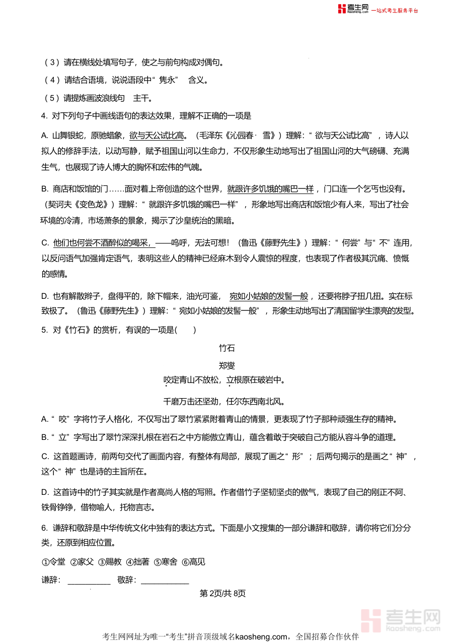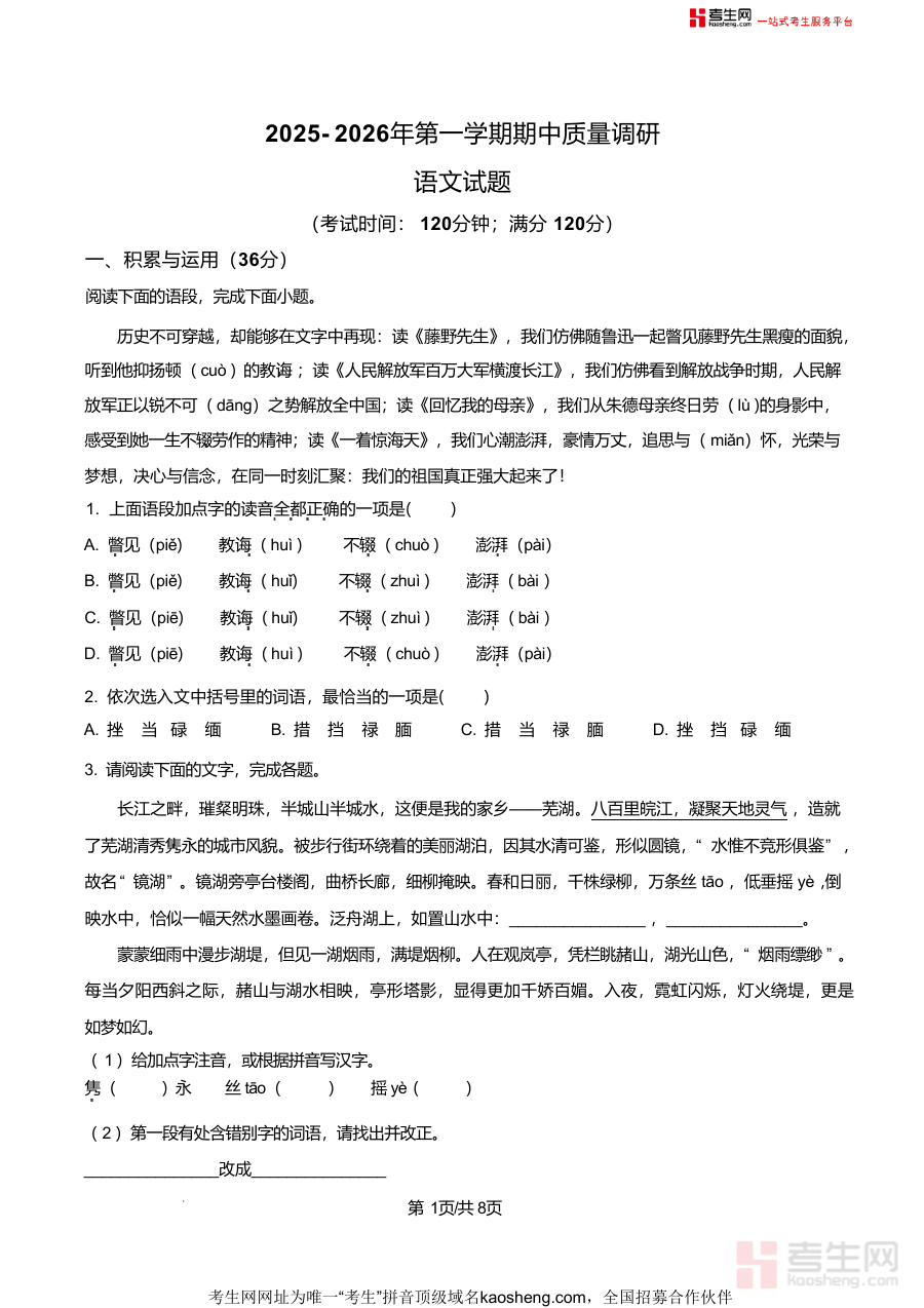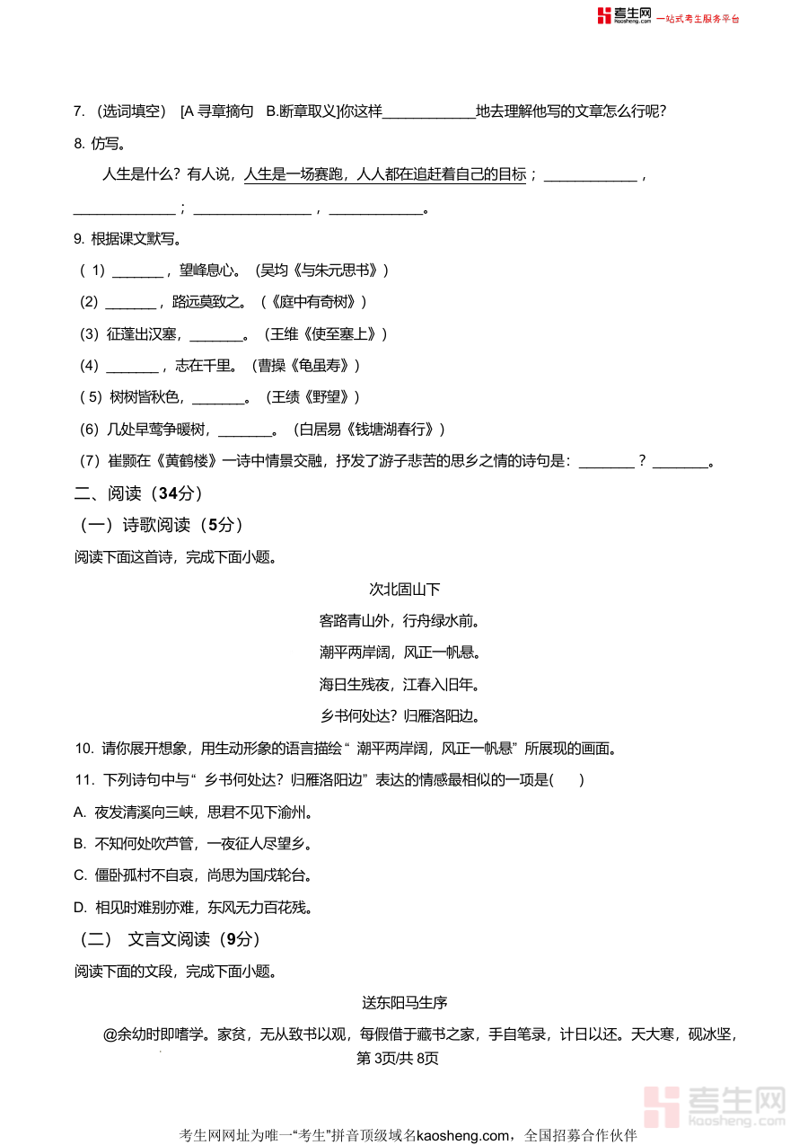 《精品解析:山东省青岛市市南区青岛超银中学2025-2026学年七年级上学期11月期中语文试题(原卷版).docx》是一份聚焦七年级学生期中语文备考需求的权威真题资料,包含积累与运用(字音字形、词语辨析、古诗文默写等)、诗歌阅读、文言文阅读(如《送东阳马生序》节选)、现代文阅读等核心考查模块,完整呈现该校期中测试命题结构与考点分布特征,特色在于保留原卷版式与题目细节,为使用者提供真实的考试场景模拟体验,是兼具实用性与权威性的备考资料.