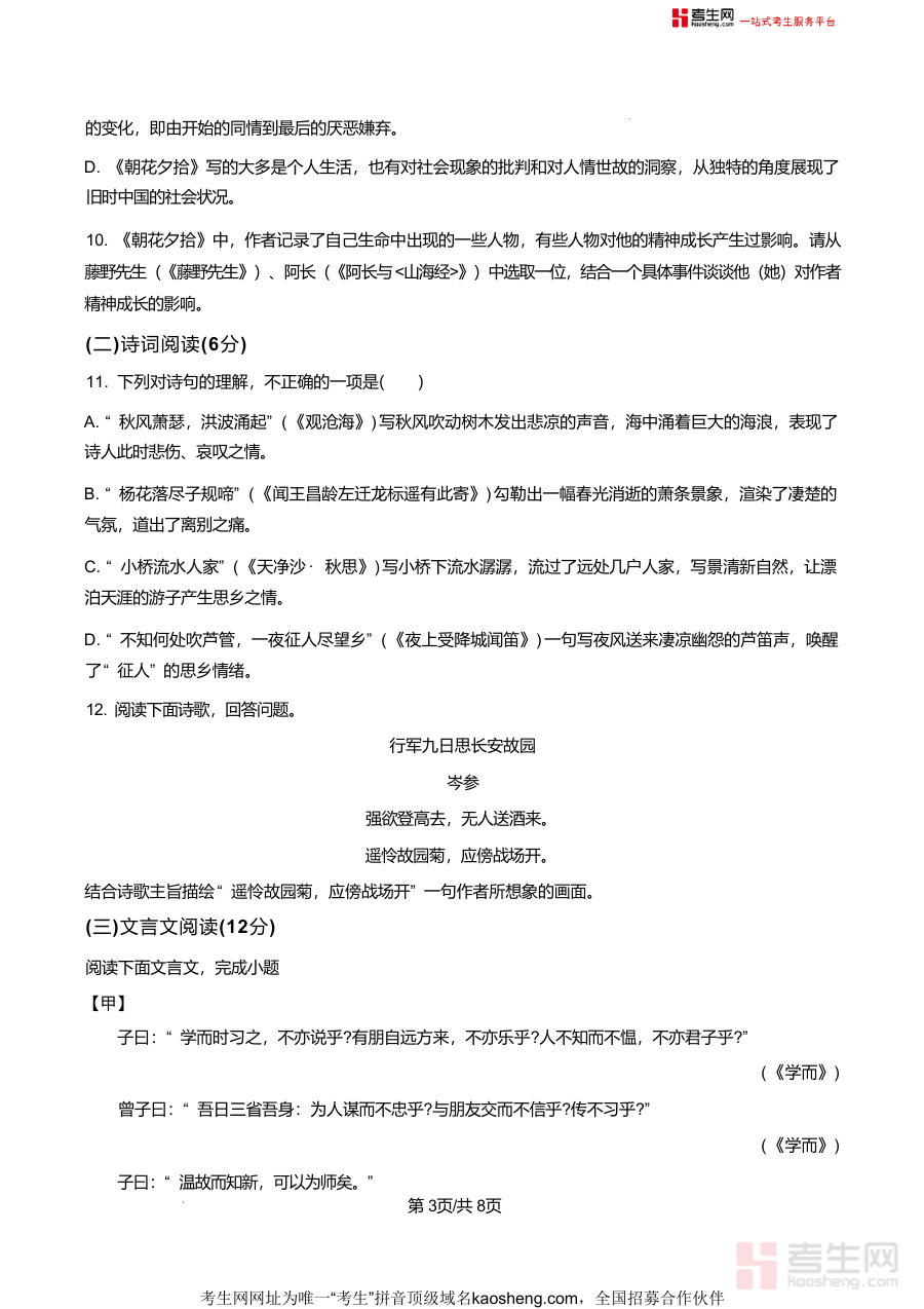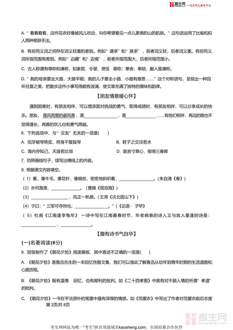 《精品解析:山东省青岛市部分初中学校2025—2026学年七年级上学期期中考试语文试题(原卷版).docx》是一份针对青岛部分初中七年级上学期期中语文考试设计的权威真题原卷资料,涵盖基础字词书写与读音辨析、病句修改、古诗文默写、名著《朝花夕拾》阅读分析、文言文对比阅读(《论语》经典章节与《李生论善学》)及现代文《秋天的怀念》阅读理解等核心考查模块;特色在于严格贴合青岛本地初中语文教学大纲要求,题型设置与本地期中命题趋势高度一致,能精准呈现七年级上学期语文知识的考查重点与能力层级要求。
