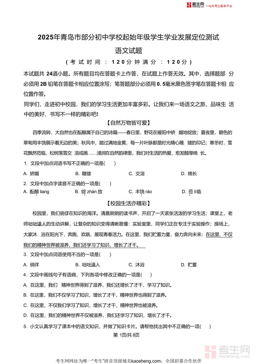 适用人群为山东省青岛市及周边地区七年级语文学生、初中语文教师及承担孩子学业辅导任务的家长;该资料的必要性在于其直接反映本地期中命题规律与考查侧重点,帮助学生提前适应考试节奏与答题要求;不可替代性体现在它是青岛部分初中实际使用的期中试题原卷,具有极强的地域针对性与实战参考价值;长期价值则在于助力学生巩固七年级上学期语文核心知识点,培养规范答题习惯与深度阅读思维,为后续语文学习积累扎实基础与方法经验。