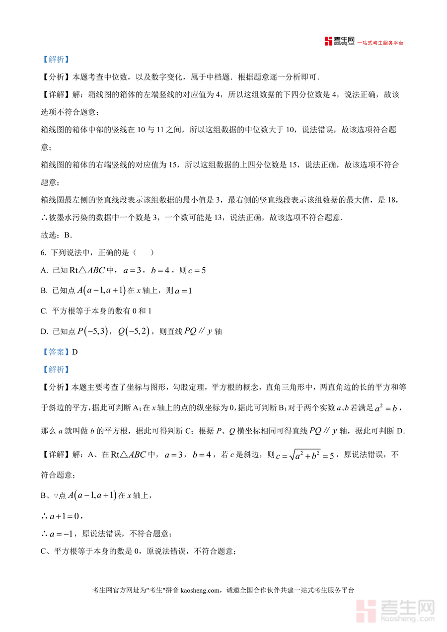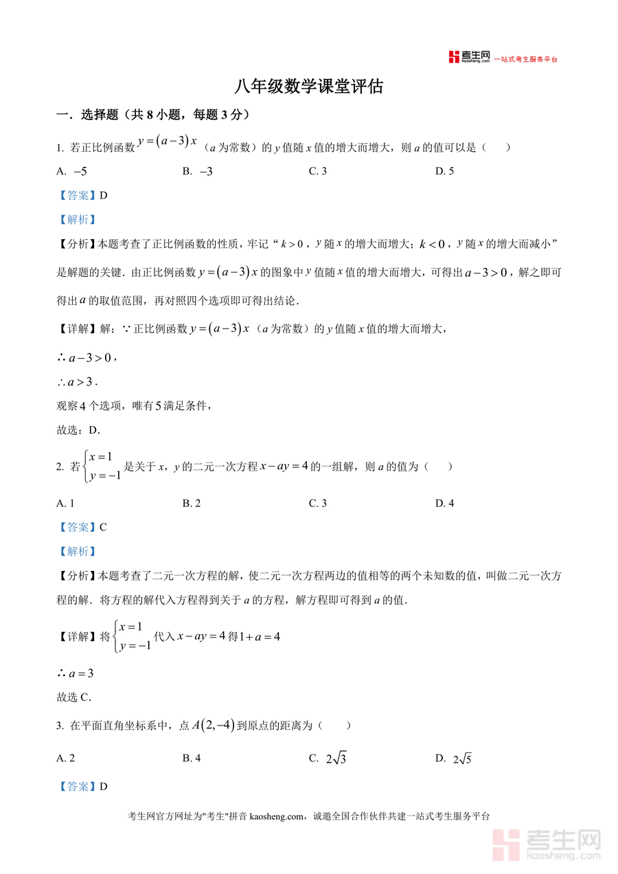 《精品解析:广东省深圳市罗湖外语学校2025-2026学年上学期八年级数学月考试题(解析版).docx》是一份针对深圳罗湖外语学校八年级上学期数学月考命题特点打造的精准备考资料。文件覆盖选择题(8小题)、填空题(5小题)及解答题(7小题)全题型内容,每道题目均配备"分析-详解-拓展"三层解析:分析模块明确考点指向(如正比例函数性质、二元一次方程解验证、勾股定理应用等),详解模块呈现逻辑化解题步骤,部分题目补充延伸技巧(如箱线图数据解读、二次根式比较方法),形成完整知识闭环,助力用户掌握题目底层逻辑。
