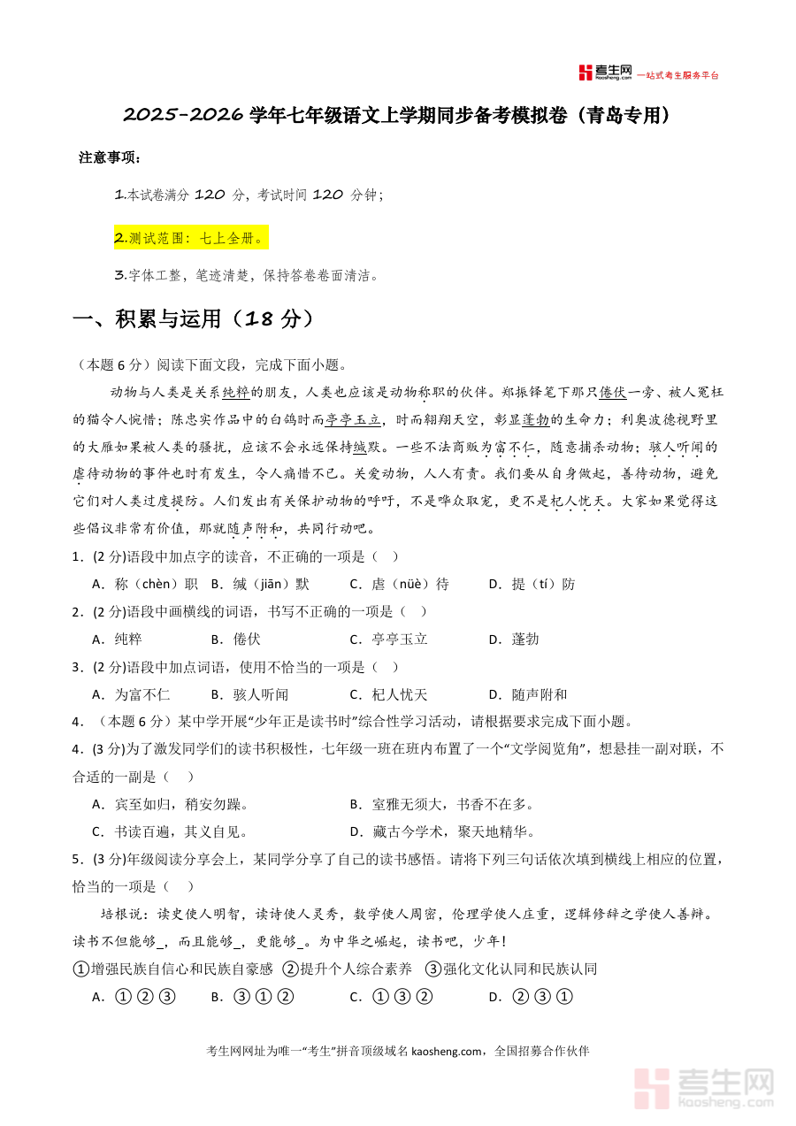 《【青岛专用】期末考试卷(一)-2025-2026学年七年级语文上学期同步备考模拟卷(统编版2024)(原卷版)docx》是一份针对青岛地区七年级上册语文期末备考的精准同步模拟资料,核心定位为贴合统编版2024教材要求的区域化备考工具;主要覆盖七上全册知识点,题型含积累与运用(字音字形、词语运用、古诗文默写)、阅读等板块,满分120分且考试时间120分钟严格匹配本地期末规范;特色亮点在于青岛专用属性,题型设计贴合本地教学重点与命题趋势,能有效聚焦区域化考点,提升备考针对性;
