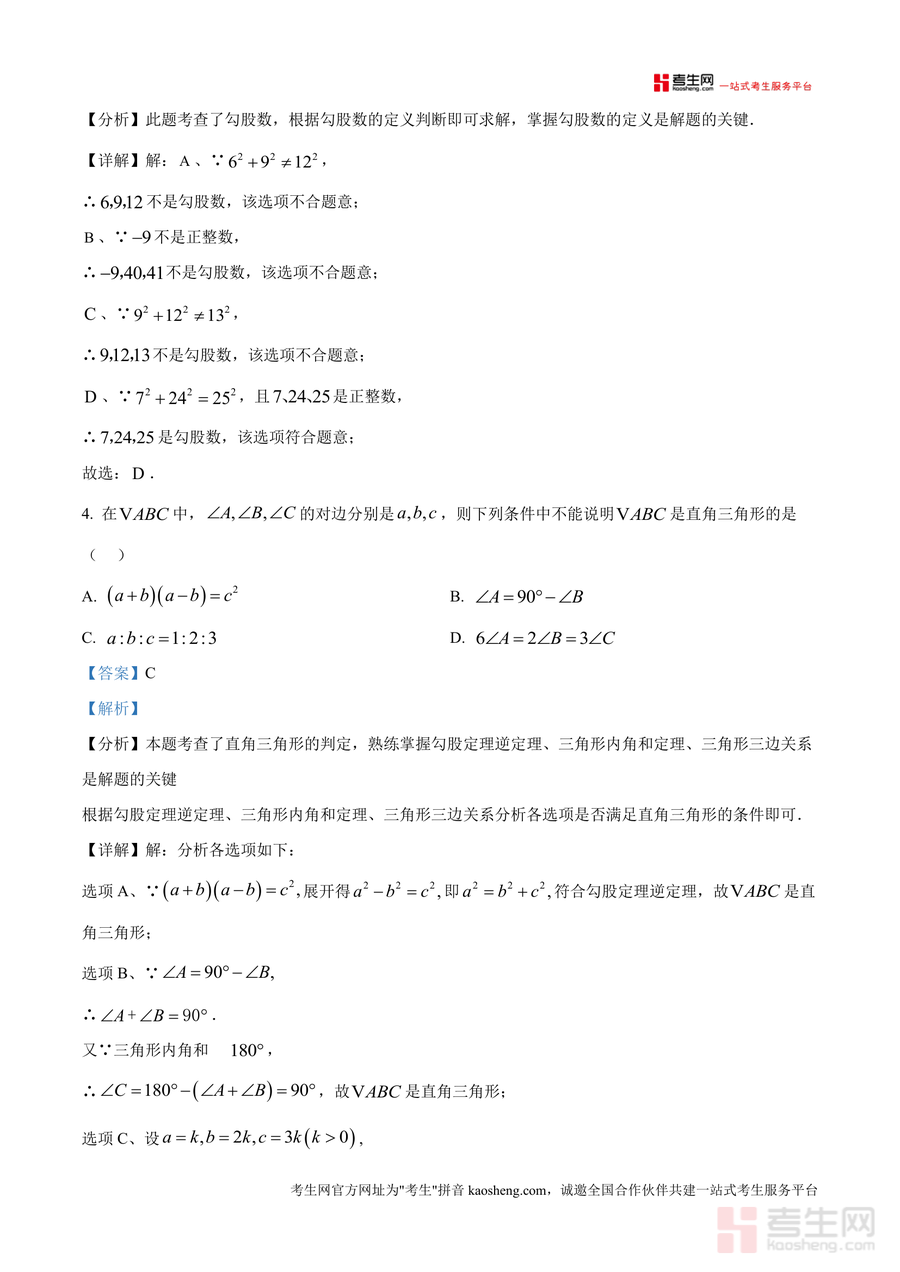 《精品解析:广东省深圳市龙华区创新实验学校2025-2026学年上学期10月月考八年级数学试卷(解析版).docx》是一份针对八年级数学阶段性检测需求打造的专业备考资料,聚焦深圳龙华区创新实验学校月考真题展开深度解析。文件涵盖选择题、填空题、解答题三大题型共20道题目,内容覆盖最简二次根式判断、勾股数识别、直角三角形判定等核心知识点,每道题均配备详细考点分析与步骤化解答过程——如选择题第7题结合《九章算术》"折竹抵地"问题讲解勾股定理应用场景,填空题第9题通过分类讨论明确直角三角形最长边计算逻辑,解答题第17题融合立方根、算术平方根及无理数估算等综合考点。特色亮点在于解析既注重基础概念夯实,又强化解题方法迁移与本地校考命题规律总结。