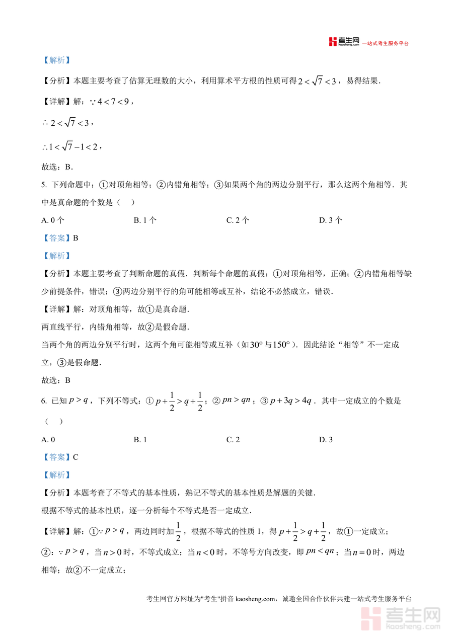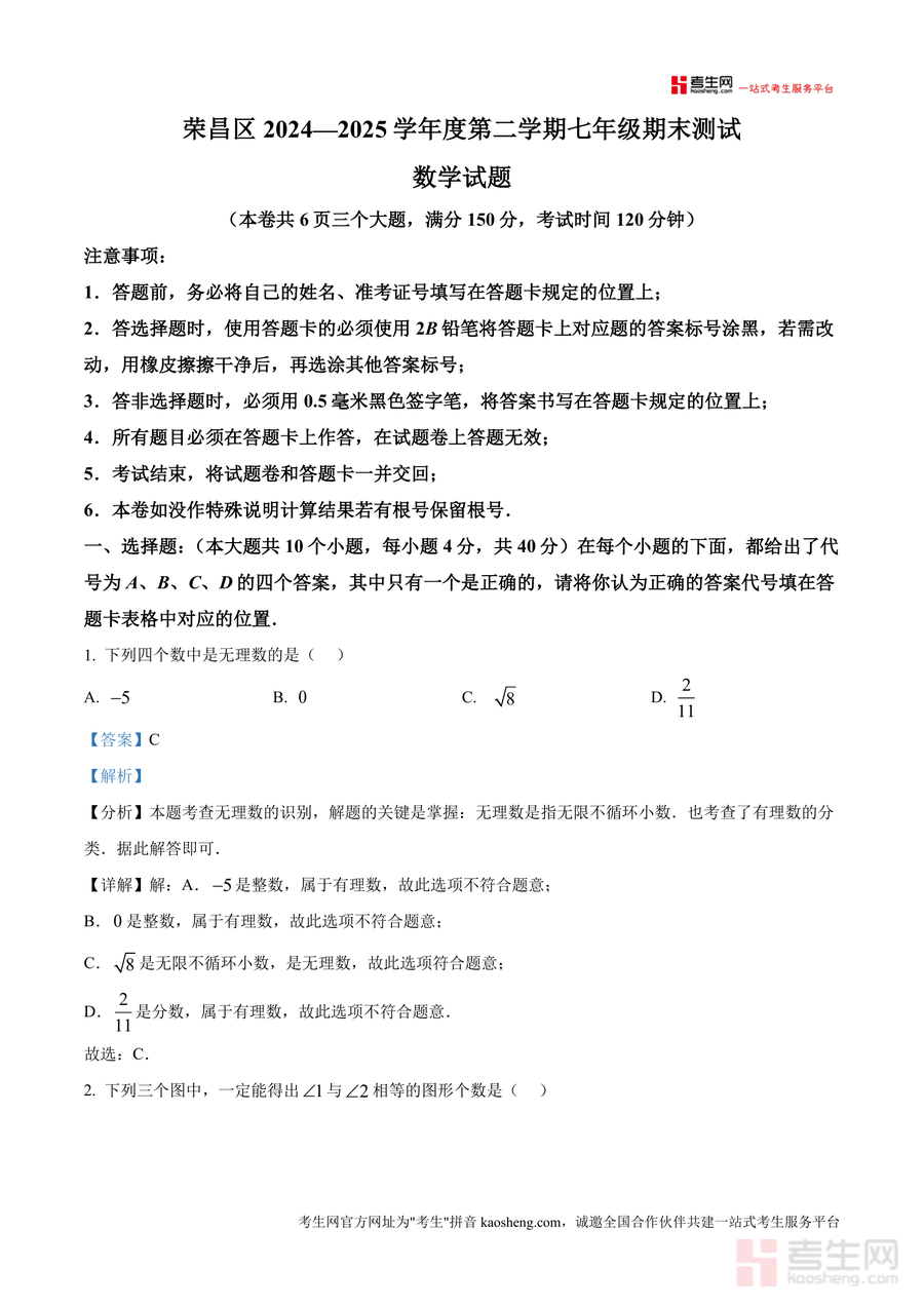 《精品解析:重庆市荣昌区2024-2025学年七年级下学期期末考试数学试题(解析版).docx》是一份针对荣昌区七年级下学期数学期末考情设计专业备考资料,包含完整试题及逐题深度解析。试题覆盖七年级下册核心知识点,如无理数识别、平面直角坐标系象限特征、不等式基本性质等题型;解析部分不仅提供标准答案,还详细分析考点来源、解题思路及易错点提示,例如对无理数题目的分类讲解帮助学生明确有理数与无理数区别,对折叠问题中的角度计算结合正方形性质与轴对称原理展开步骤说明,体现真题解析的专业性与实用性。