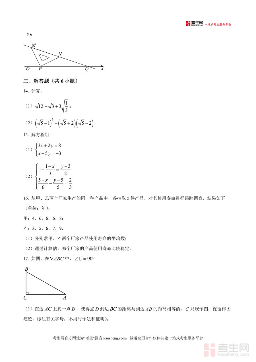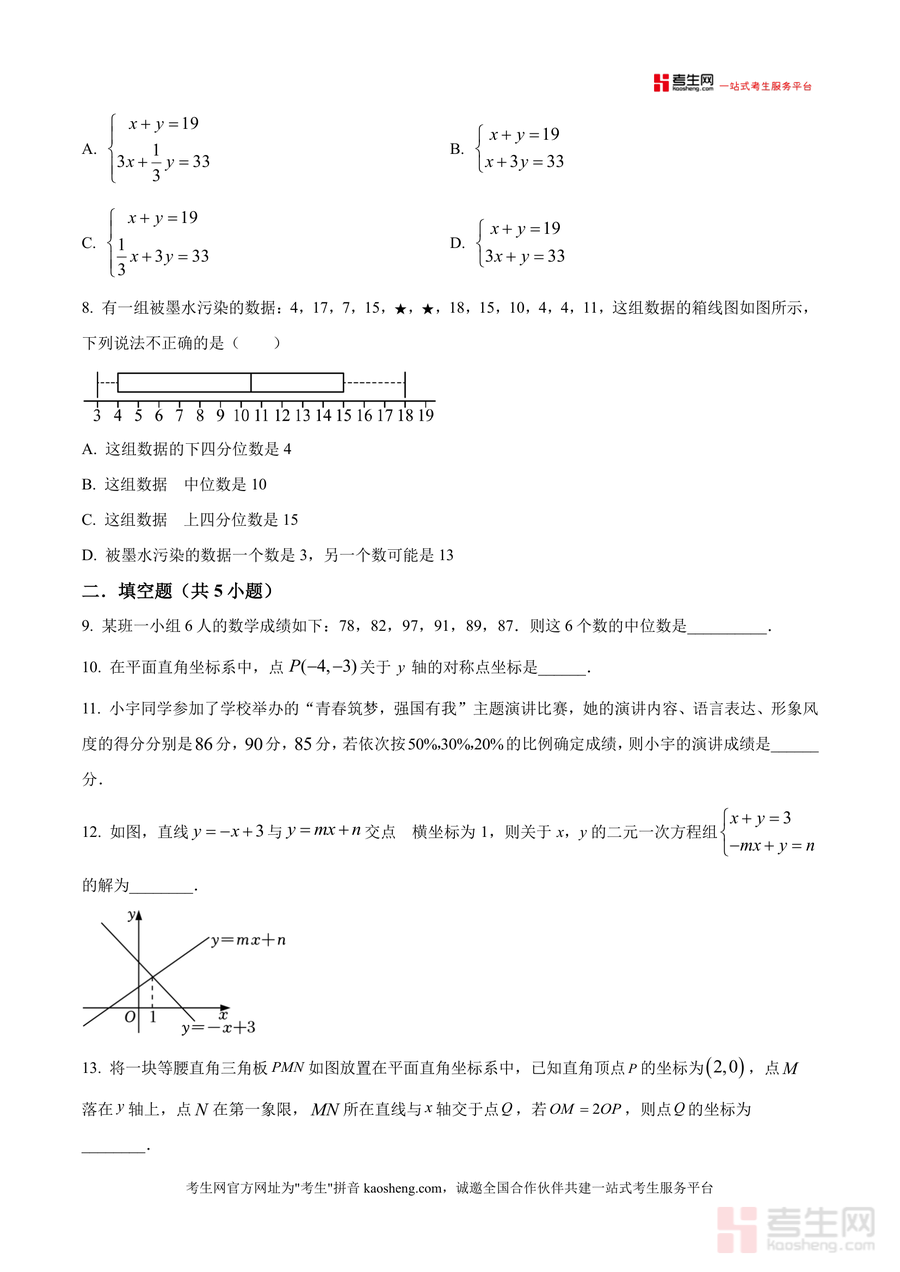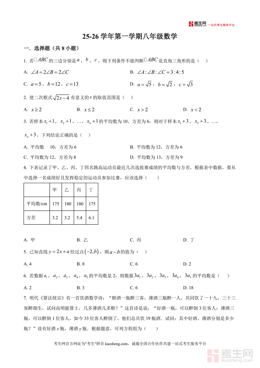 《精品解析:广东省深圳市龙华区民治中学2025-2026学年上学期八年级数学月考试卷(原卷版).docx》是一份针对深圳市龙华区民治中学八年级上学期数学阶段性考核的官方原卷资料。该试卷包含选择题(8小题)、填空题(5小题)、解答题(6小题)三大题型,覆盖直角三角形判定条件、二次根式有意义取值范围、统计量(平均数、方差)计算与应用、二元一次方程组建立与求解、平面直角坐标系对称点及直线交点等核心知识点。其特色在于严格贴合民治中学本地教学进度与考核要求,融入深圳中考基础能力考查方向,题型设置兼顾基础巩固与能力提升,是一份高质量备考资料。