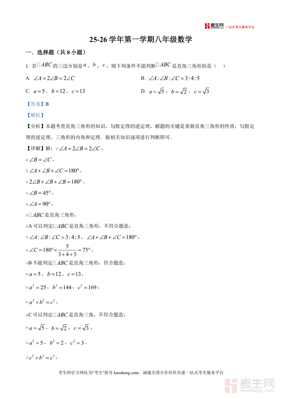 《精品解析:广东省深圳市龙华区民治中学2025-2026学年上学期八年级数学月考试卷(解析版).docx》是一份针对民治中学八年级上学期数学月考真题及配套解析编制而成专业备考资料。该资料完整呈现月考题型结构,含选择题8道、填空题5道及解答题6道,覆盖勾股定理逆定理、二次根式有意义条件、统计量(平均数与方差)计算、一次函数应用及二元一次方程组求解等八年级数学核心考点。其特色亮点在于每道题配备详尽解析,涵盖考点分析、解题思路拆解及步骤推导,如第1题多角度验证勾股定理逆定理应用条件,第3题系统推导样本数据变换后方差性质,助力学生深入理解考点本质。