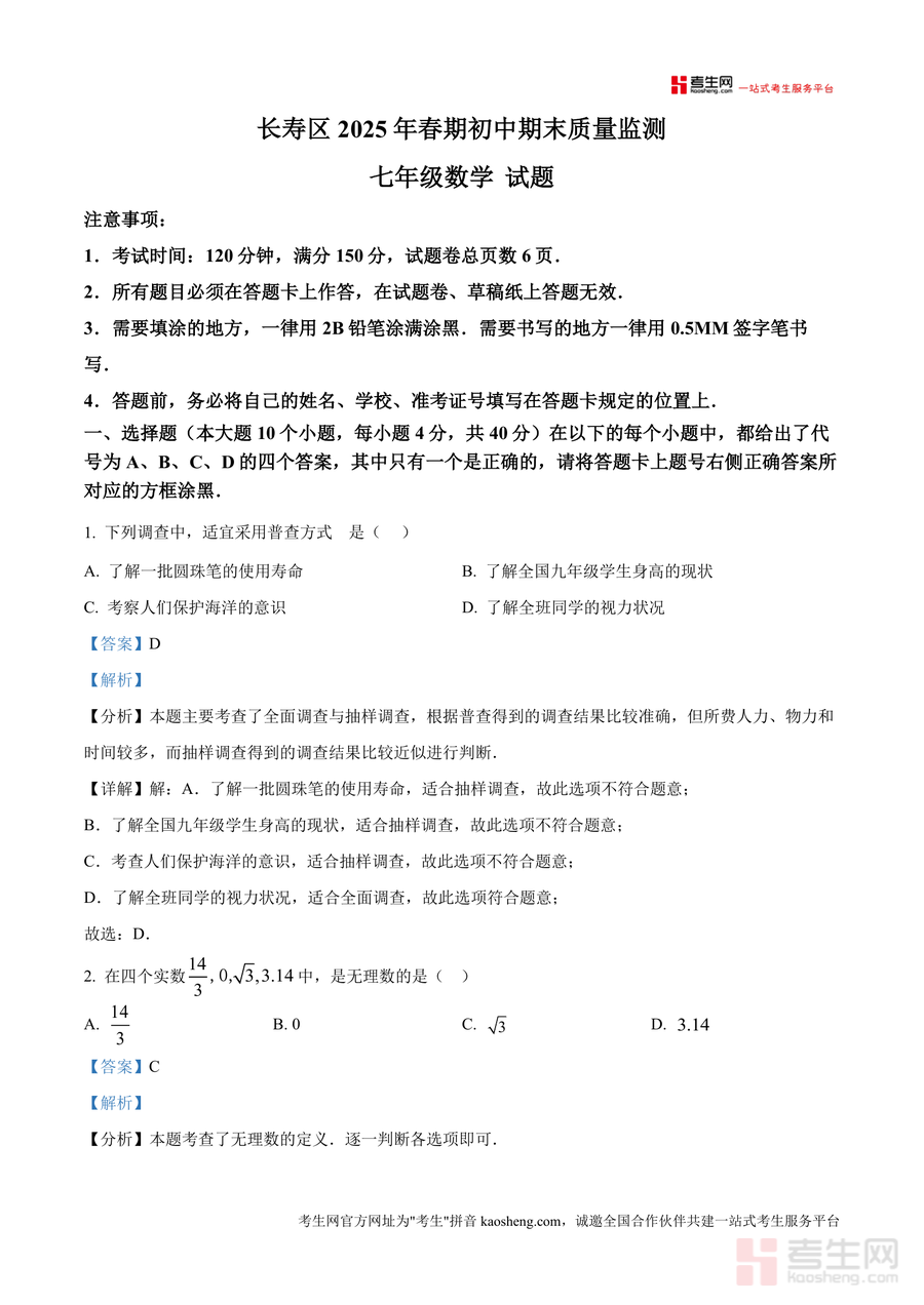 《精品解析:重庆市长寿区2024-2025学年七年级下学期期末考试数学试题(解析版).docx》是一份针对长寿区七年级下学期数学期末备考需求的专业真题解析资料,涵盖选择题、填空题、解答题三大题型共19道题目及完整解析内容。资料特色在于每道题均标注核心考点(如普查与抽样调查分类、无理数定义判定、平行线性质应用等),并通过“分析-详解-总结”三步法拆解解题思路,同时补充易错点提示与同类题型拓展,帮助学生精准把握知识点应用场景。此外,资料严格遵循本地考试时间、分值设置及答题规范要求,确保内容与实际考试高度贴合。